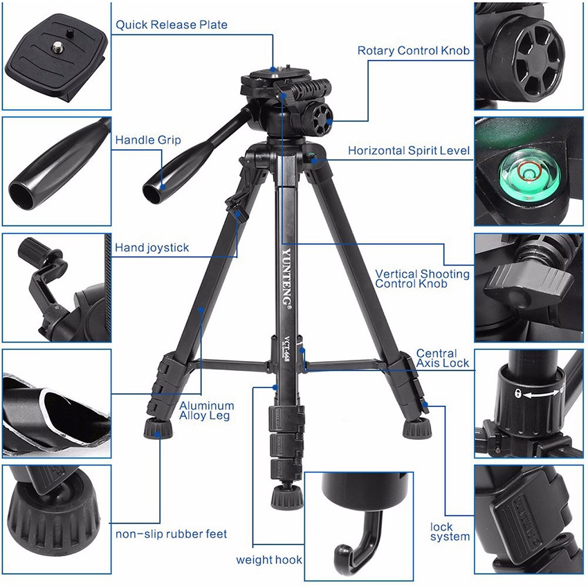 Thiết kế linh hoạt, dễ dàng điều chỉnh độ cao Chân Máy Ảnh Tripod Yunteng VCT-668 giúp bạn có những bức ảnh phong cảnh tuyệt đẹp mà không cần phải tốn quá nhiều công sức để canh chỉnh máy. Đó là nhờ vào thước đo cân bằng loại tâm điểm của máy cùng thiết kế linh hoạt, dễ dàng xoay theo nhiều hướng. Chân máy nhẹ nhàng và chắc chắn Chân máy ảnh nhẹ và bền, di chuyển rất dễ dàng. Ngoài ra, các bộ phận kim loại của chân đều được phủ lớp sơn chống oxy hóa, đem lại sự bền bỉ cho sản phẩm. Với chiều dài của chân máy bạn có thể dễ dàng đem chân máy ảnh của mình trong những chuyến pinic và du lịch. Chân máy ảnh thiết kế dành riêng cho những chiếc máy ảnh, máy quay phim gia đình với kích thước gọn nhẹ, dễ di chuyển, dễ sử dụng. Không chỉ giúp chụp ảnh dễ dàng, giảm tình trạng mờ nhòe do rung tay, chân máy ảnh còn đem lại cho bạn sự linh động để thoải mái sáng tạo những khung hình đẹp.  Hỗ trợ chụp ảnh chuyên nghiệp Giờ đây, những bức ảnh đường chân trời, ảnh phong cảnh hay các công trình kiến trúc của bạn sẽ được canh thẳng và chụp thật chuyên nghiệp mà không tốn quá nhiều công sức khi canh chỉnh. Ngoài ra, với thiết kế linh hoạt, dễ dàng xoay theo nhiều hướng, đồng thời xoay máy ảnh lên xuống, trái phải hay xoay ngang 90 độ, bạn có thể chụp vật thể ở các góc độ khác nhau, sở hữu những khung ảnh theo chiều dọc độc đáo
