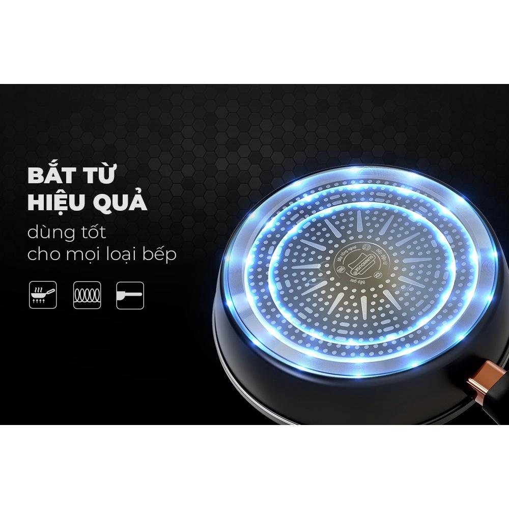 ️ Kích thước chảo: - Chảo 16cm: 16X5cm - Chảo 20cm: 20x5,5cm - Chảo 24cm: 24x6cm - Chảo 26cm: 26x6,5cm - Chảo 28cm: 28x7cm Đặc điểm nổi bật - Công nghệ chống dính Nano Titanium