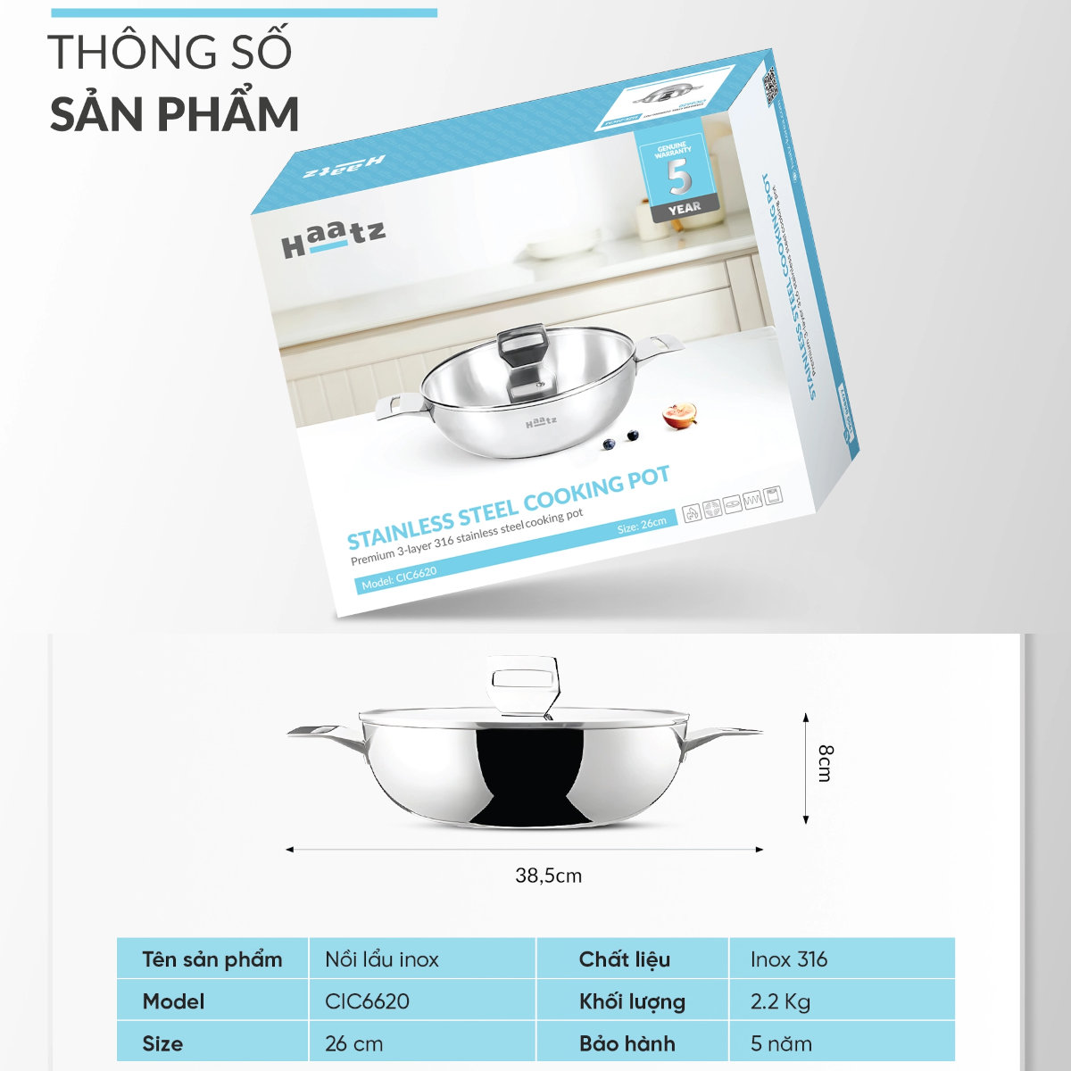 Nồi lẩu inox 316 đúc liền khối HAATZ CIC6620 size 26cm kèm vung kính - Zalo 0986588655