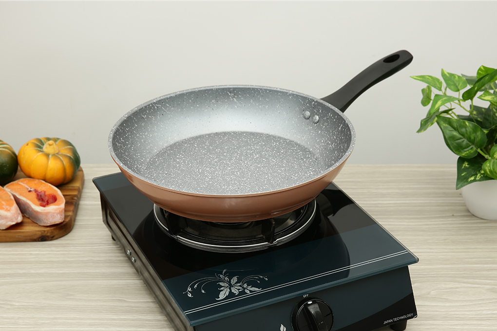 Kích thước Chảo đáy từ vân đá chống dính vừa vặn, không quá nặng tay, phù hợp để làm các món chiên xào hoặc áp chảo.