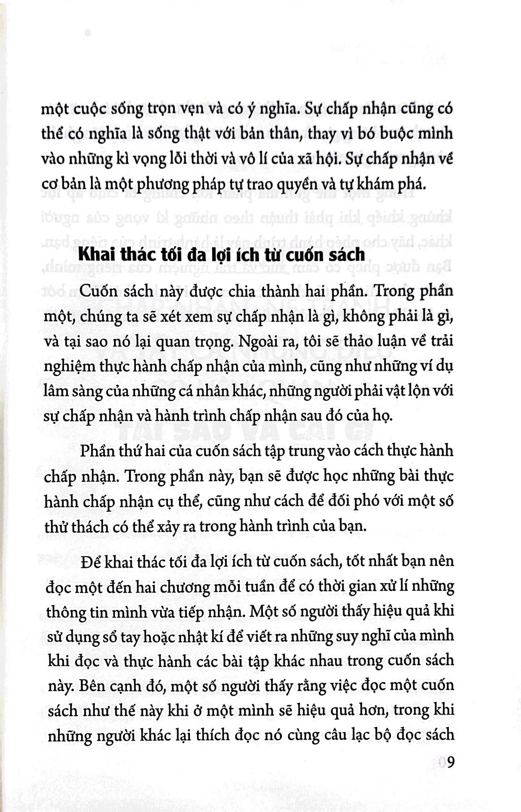 Cuốn sách được chia làm hai phần. Phần một sẽ đưa bạn đọc xem xét và tìm hiểu thế nào là chấp nhận, tại sao sự chấp nhận là quan trọng và cung cấp cho độc giả những ví dụ lâm sàng của những cá nhân khác - những người đang phải vật lộn với sự chấp nhận và hành trình sau đó của họ. Phần thứ hai của cuốn sách sẽ tập trung vào cách thực hành chấp nhận qua các bài thực hành cụ thể, cũng như cách để đối phó với những thử thách có thể xảy ra trên hành trình của bạn.