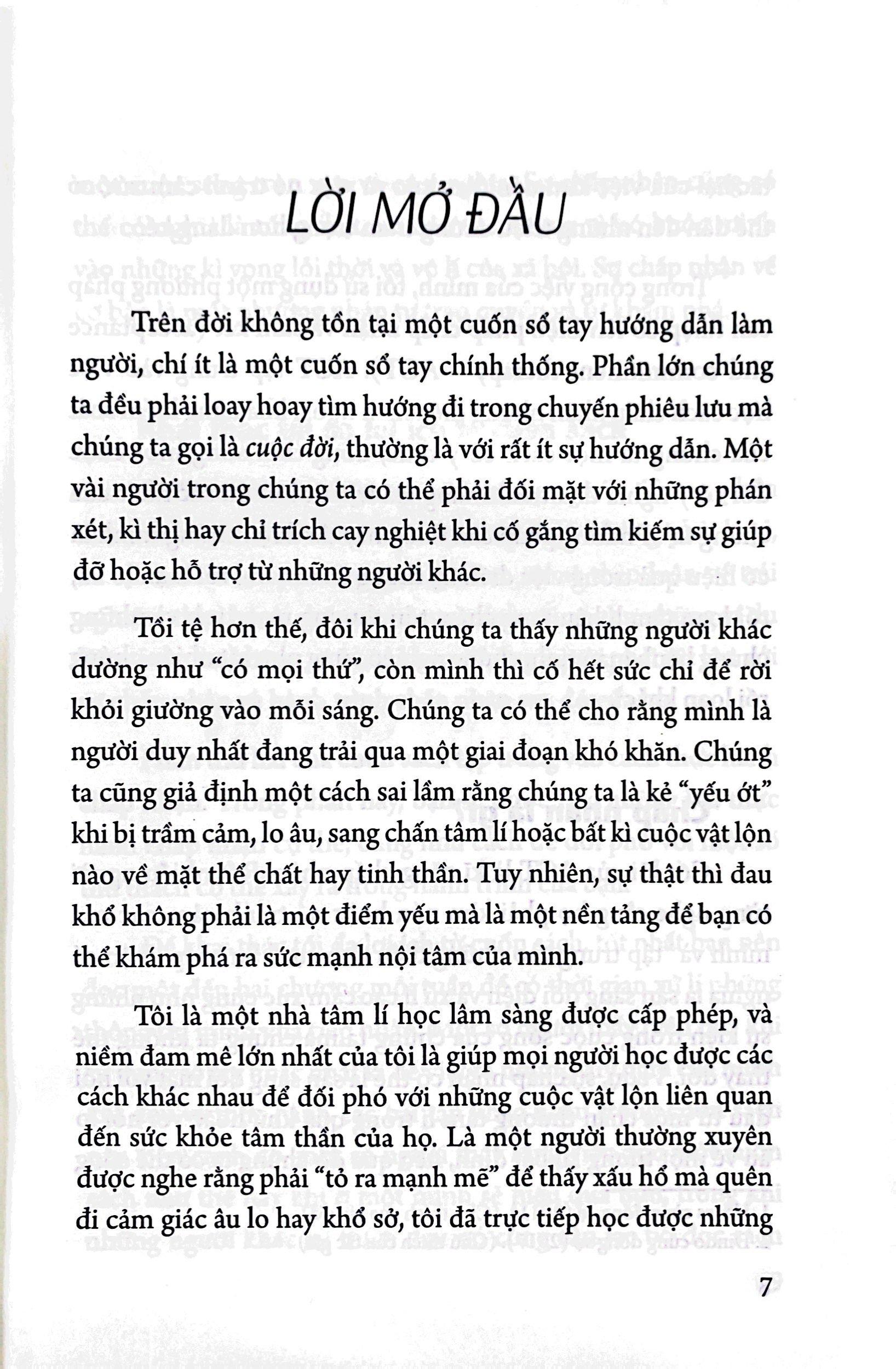Trên đời không tồn tại một cuốn sổ tay hướng dẫn làm người, chi ít là một cuốn sổ tay chính thống. Phần lớn tất cả chúng ta đều đang loay hoay tìm kiếm con đường để bước đi trong chuyến phiêu lưu vĩ đại mang tên cuộc đời, thường là với rất ít sự hướng dẫn. Chúng ta thường cho rằng m.ình là người duy nhất gặp khó khăn và giả định một cách sai lầm rằng chúng ta là "kẻ yếu ớt" khi bị trầm cảm, lo âu, sang chấn tâm lí hoặc bất kì sự vật lộn nào về mặt thể chất hay tinh thần.