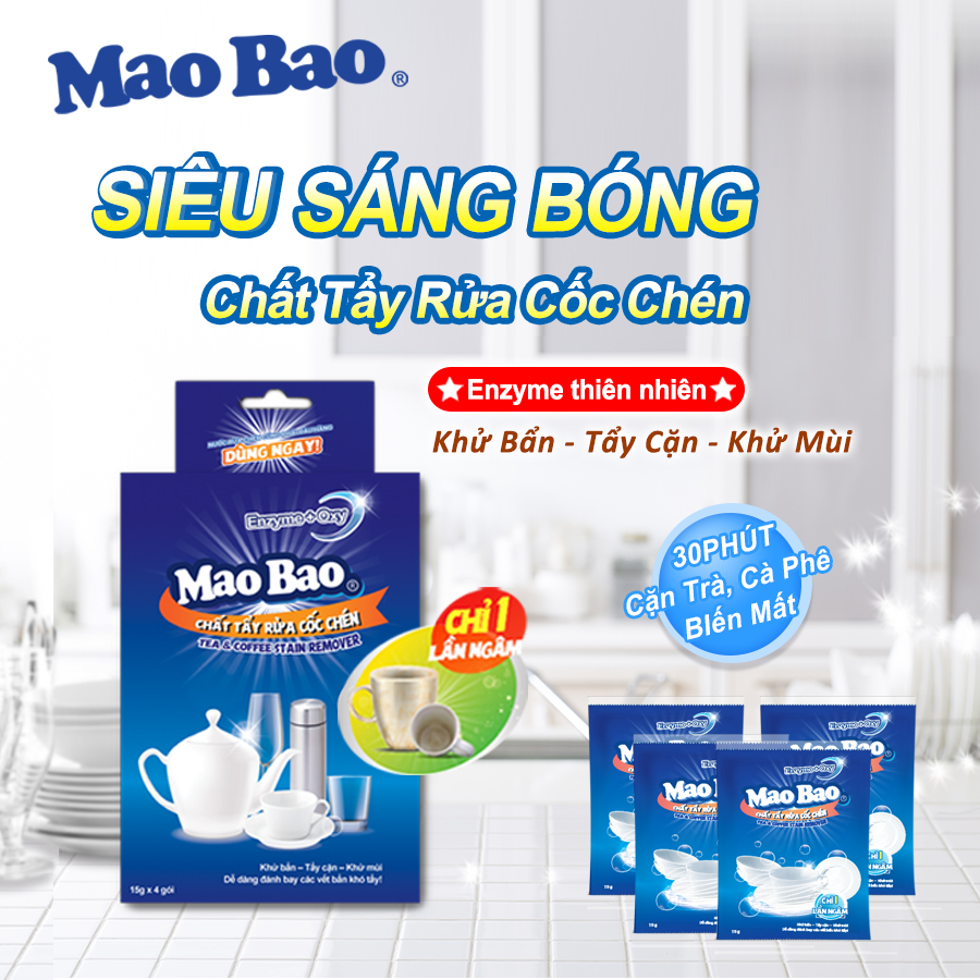 - Chất Tẩy Rửa Cốc Chén Siêu Sáng Bóng Mao Bao chuyên xử lý các vết ố vàng, vết xỉn màu, mảng bám, cặn bẩn lâu ngày từ trà, cà phê chỉ với 1 lần ngâm mà không cần phải cọ rửa nhiều lần.