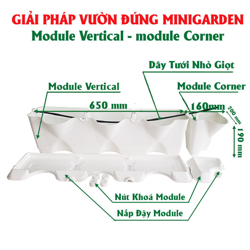 • Gồm 1 module Minigarden Vertical (Ngang 65cm x Cao 20cm) + 1 Nắp đậy + 6 nút khóa Module