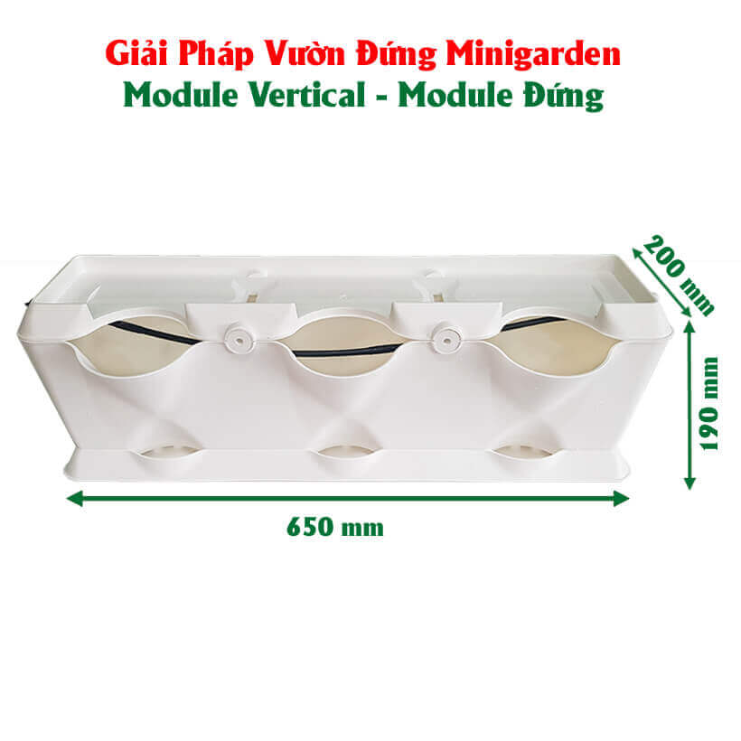 • Kích thước Module trồng rau Đứng: Ngang 65cm x Rộng 20cm X Cao 20cm. Trồng được 3 cây. Gồm 1 module + 1 Nắm đậy + 6 nút cài cố định Module