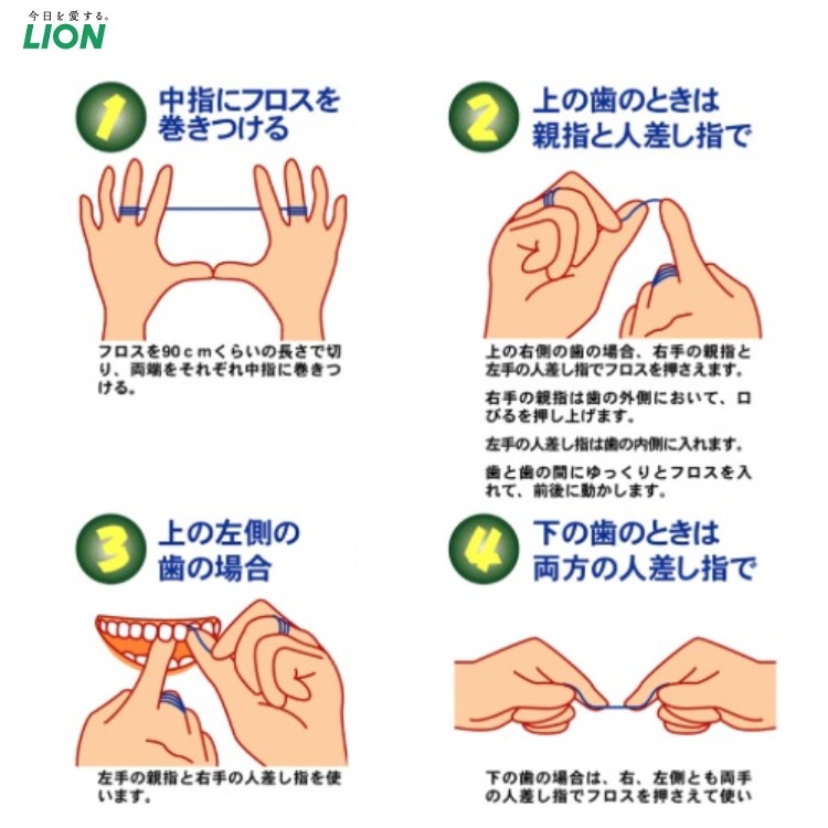 Dùng hai đầu chỉ luồn vào các kẽ răng, nhẹ nhàng nhấc chỉ lên để lấy hết các vụn thức ăn và mảng bám ra.