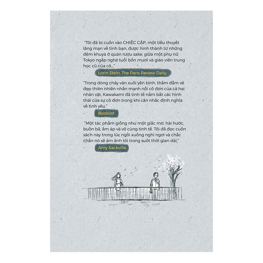 Mua tại Tiktok"Tôi đã bị cuốn vào Chiếc Cặp, một tiểu thuyết lãng mạn về tình bạn, được hình thành từ những đêm khuya ở quán rượu sake, giữa một phụ nữ Tokyo ngấp nghé tuổi bốn mươi và giáo viên trung học cũ của cô" - Lorin Stein, The Paris Review Daily