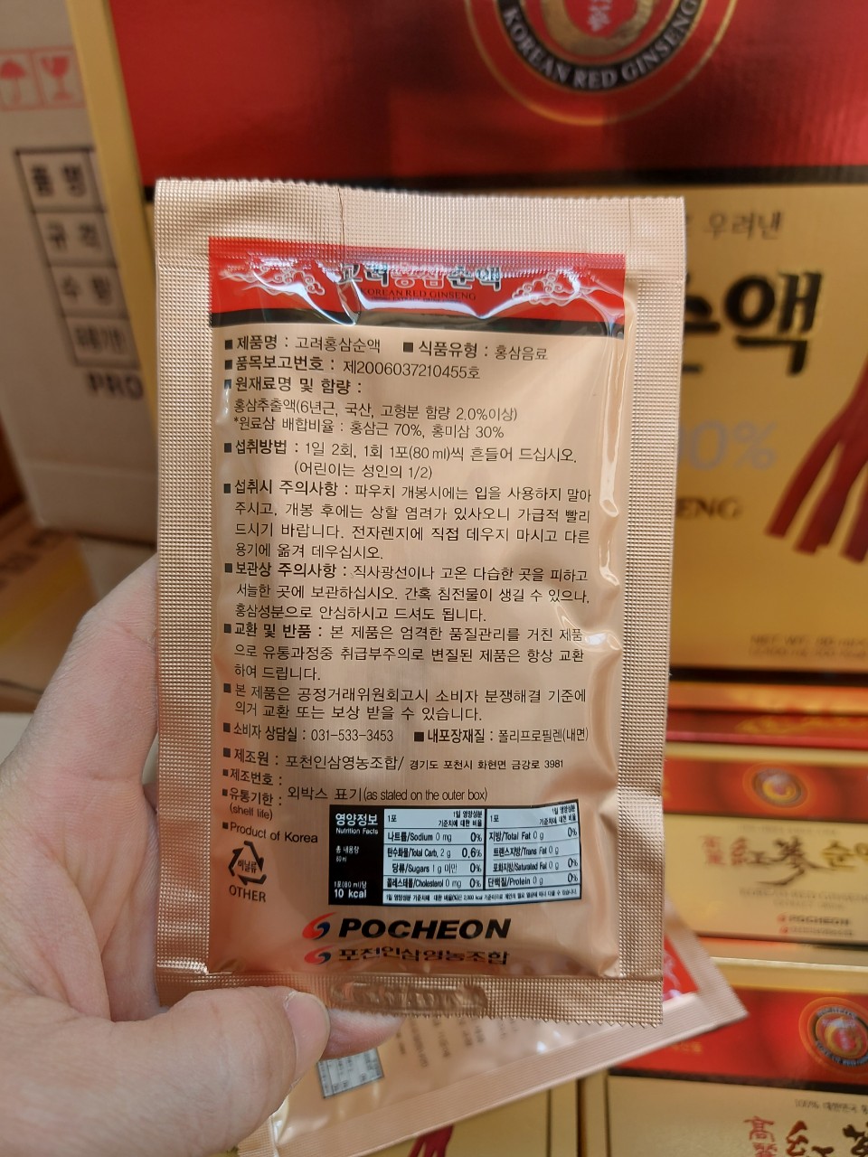 Thông tin chi tiết sản phẩm 1. Tên sản phẩm: Thực phẩm bảo vệ sức khỏe: Hongsamjin Bichaek Hwanghu Korean Red Ginseng Extract 2. Thành phần: Trong 1 gói sản phẩm 120 ml chứa: Hồng sâm cô