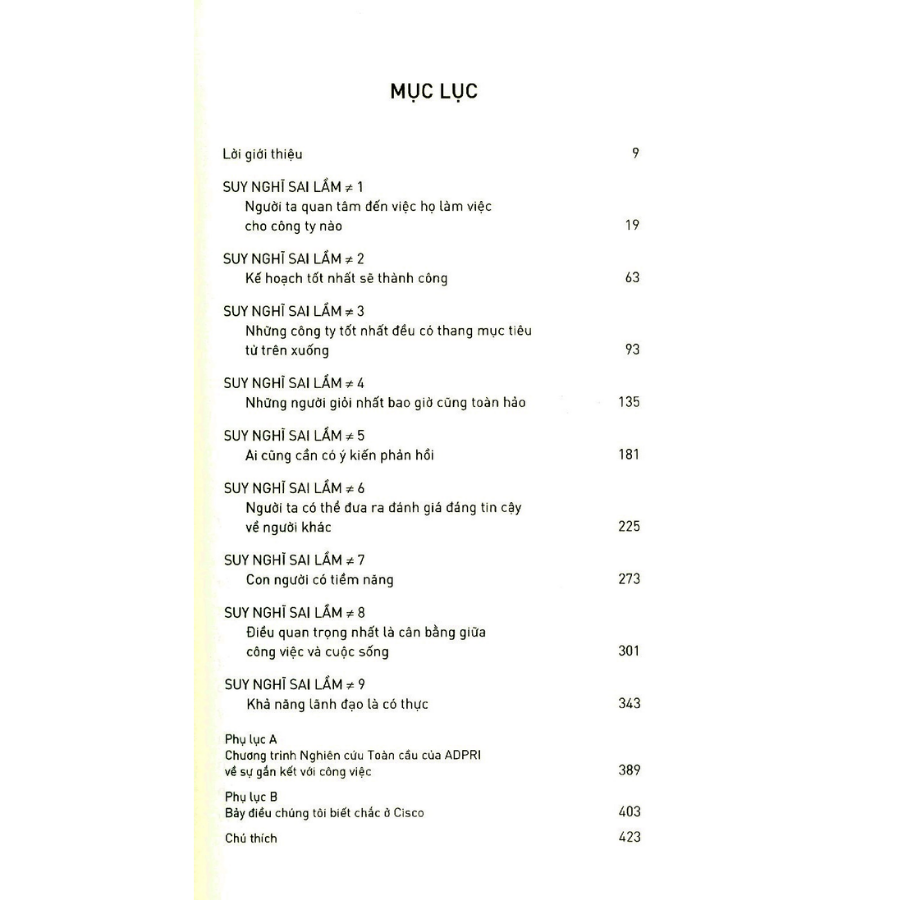 Những điều trên nghe ra có vẻ như là những chân lý nền tảng cho đời sống công việc của chúng ta ngày hôm nay. Nhưng thực ra, chúng là những điều không thật. Trong cuốn sách Chín suy nghĩ sai lầm về công việc gây tranh cãi và truyền cảm hứng này, chúng ta sẽ gặp những điều không thật này – những lệch lạc, những giả định đầy khuyết điểm, và suy nghĩ sai lầm – mỗi khi chúng ta tới nơi làm việc. Chúng dẫn đến rối loạn và thất vọng, và cuối cùng khiến công sở của chúng ta trở thành một cái bóng mờ nhạt của những gì lẽ-ra-có-thể-tốt-hơn.