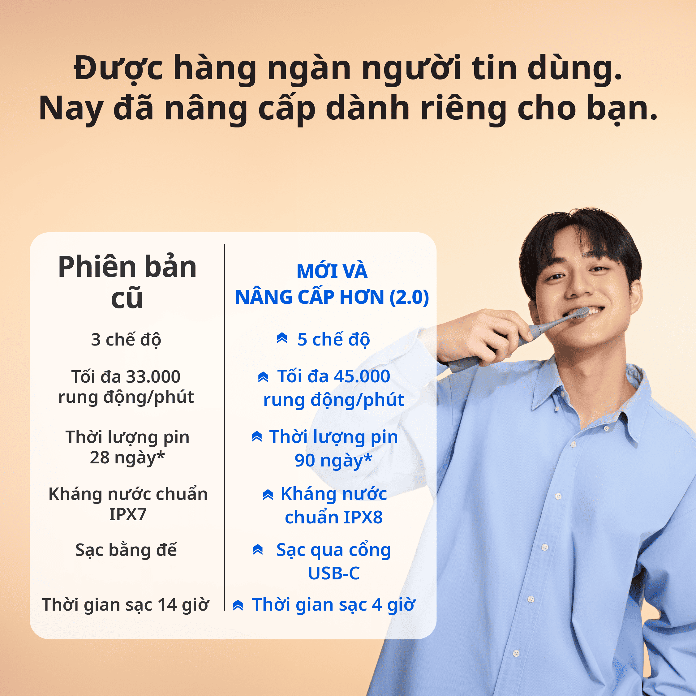LƯU Ý: Quý khách vui lòng check kỹ toàn bộ sản phẩm nhận được và quay video toàn bộ quá trình bóc hàng. Shop chỉ giải quyết khi có video. Shop xin cảm ơn!   Bàn chải điện ZenyumSonic 2.0 là phiên bản nâng cấp của ZenyumSonic trước đây, ZenyumSonic 2.0 màu tự chọn với 7 màu thời thượng: Đen/Trắng/Hồng/Xanh Mint/Xanh dương và 2 sắc màu mới Tím và Xám   Trong mỗi hộp bàn chải đánh răng điện ZenyumSonic 2.0 bao gồm: 01 thân bàn chải điện 01 đầu bàn chải 01 sạc pin không dây (bao gồm đế sạc, dây cable cổng USB, không bao gồm adapter) 01 phiếu bảo hành 01 hướng dẫn sử dụng   Thông tin sản phẩm bàn chải đánh răng điện ZenyumSonic 2.0: Thương hiệu: Zenyum Công nghệ: Singapore Xuất xứ: Trung Quốc Chất liệu: nhựa TPE, sợi Dupont **Khuyến nghị sử dụng sản phẩm cho trẻ em từ 12 tuổi trở lên   Đặc điểm vượt trội của sản phẩm: Nút nhấn với 5 chế độ chuyên biệt ( trước đây chỉ có 3 chế độ): LÀM SẠCH, LÀM TRẮNG, LÀM SẠCH SÂU, ÊM DỊU, MASSAGE NƯỚU Sợi lông chải Dupont mềm mại loại bỏ mảng bám tốt hơn, đồng thời đem lại sự êm ái cho răng và nướu Công nghệ micro-pressure bubble tạo ra hàng triệu vi bong bóng giúp nhanh chóng làm sạch sâu từng kẽ răng Cơ chế hẹn giờ trong 2 phút, rung nhắc chuyển vùng mỗi 30s, cho hiệu quả làm sạch tối ưu theo khuyến cáo của nha sĩ Thời lượng pin lên tới 90 ngày (với 2 lần sử dụng/ngày) cho mỗi lần sạc đầy đủ Sạc nhanh qua cổng USB-C ở đuôi bàn chải, đèn thông minh báo hiệu hết pin và sạc đầy Thời gian sạc chỉ 4 giờ (trước đây 8 giờ) sạc nhanh, tiện lợi hơn Nâng cấp chuẩn chóng nước IPX8 ( trước đây là IPX7) ,an toàn khi sử dụng trong phòng tắm hoặc dưới nước và chống nước 100%   Thời lượng pin trung bình khi sử dụng 2 phút/lần, 2 lần/ngày. Kết quả có thể thay đổi tùy theo người dùng.   Hướng dẫn sử dụng: Cho một lượng kem đánh răng bằng hạt đậu lên đầu bàn chải. Nhấn nút + để khởi động bàn chải điện Tiếp tục nhấn nút + để thay đổi chế độ chải phù hợp Di chuyển đầu bàn chải nhẹ nhàng quanh các răng. Đổi bên sau mỗi 30 giây khi có tín hiệu rung.   Tùy Chỉnh với 5 chế độ chải răng: LÀM SẠCH: Chế độ hoàn hảo hàng ngày để vệ sinh hiệu quả, nhắm tới mọi khu vực khó tiếp cận. LÀM TRẮNG: Chế độ giúp đánh bóng và loại bỏ những vết bẩn trên bề mặt răng. LÀM SẠCH SÂU: Kéo dài thời gian đánh răng lên 3 phút, dành cho những ngày bạn cần vệ sinh răng miệng kỹ lưỡng hơn. ÊM DỊU: Phù hợp với những người có răng và nướu nhạy cảm hoặc những người mới sử dụng bàn chải điện lần đầu. MASSAGE NƯỚU: Chế độ nhẹ nhất để massage nhẹ nhàng đồng thời loại bỏ mọi cặn bẩn trên nướu. *Khuyến nghị thay đầu bàn chải sau 3 hoặc 6 tháng sử dụng để đảm bảo hiệu quả làm sạch   Cách Sạc Bàn Chải Điện ZenyumSonic2.0: Vặn nắp ở đáy bàn chải ngược chiều kim đồng hồ để mở cổng sạc USB-C. Đảm bảo cổng sạc khô hoàn toàn trước khi cắm sạc. Biểu tượng chế độ nhấp nháy khi đang sạc; sáng ổn định khi sạc hoàn tất. Thời gian sạc khoảng 4 giờ. Sau khi sạc xong, rút dây và vặn nắp lại theo chiều kim đồng hồ. Mẹo Sử Dụng: Rửa sạch đầu bàn chải sau mỗi lần dùng. Lau khô tay cầm bằng khăn mềm và để khô tự nhiên. Bảo quản nơi khô ráo, tránh ánh nắng trực tiếp. Thay đầu bàn chải sau mỗi 3 tháng sử dụng.   Chế độ bảo hành: Sản phẩm được bảo hành lỗi 1 đổi 1 trong 1 năm đối với các lỗi kỹ thuật điện, không bảo hành vấn đề bong tróc và các lỗi chủ quan trong quá trình sử dụng Cách thức liên hệ bảo hành: INBOX CHO SHOP   ZENYUM cam kết: ZENYUM cam kết mang đến cho khách hàng sản phẩm chính hãng với chất lượng tốt nhất trong tầm giá ZENYUM cam kết chính sách bảo hành tốt nhất cho khách hàng Cùng ZENYUM Sonic cải thiện thói quen chăm sóc răng miệng hiệu quả và sở hữu nụ cười trắng sáng rạng rỡ hơn mỗi ngày.   Lưu ý: Bàn chải chỉ tương thích với đầu bàn chải thay thế phiên bản tiêu ZenyumSonicvà đầu bàn chải thay thế phiên bảm êm dịu ZenyumSonic Không tương thích với đầu bàn chải thay thế ZenyumSonic Spark và ZenyumSonic Go   Hãy follow Zenyum để nhận ưu đãi/ voucher nhé!
