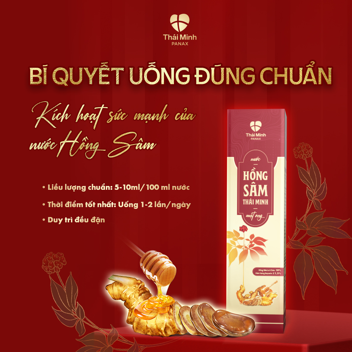 - Lấy khoảng 5-10ml nước Hồng sâm Thái Minh mật ong pha trong 100ml nước ấm (60°C), khuấy đều và sử dụng.