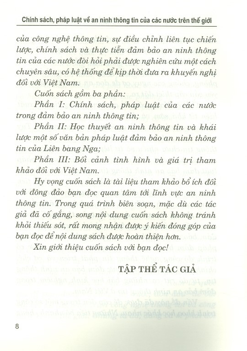 Mua tại TiktokGiới thiệu những chính sách, pháp luật của nhà nước trong đảm bảo an ninh thông tin; trình bày các học thuyết an ninh thông tin và khái lược một số văn bản pháp luật đảm bảo an ninh thông tin của Liên bang Nga; khái quát bối cảnh tình hình và giá trị tham khảo đối với Việt Nam