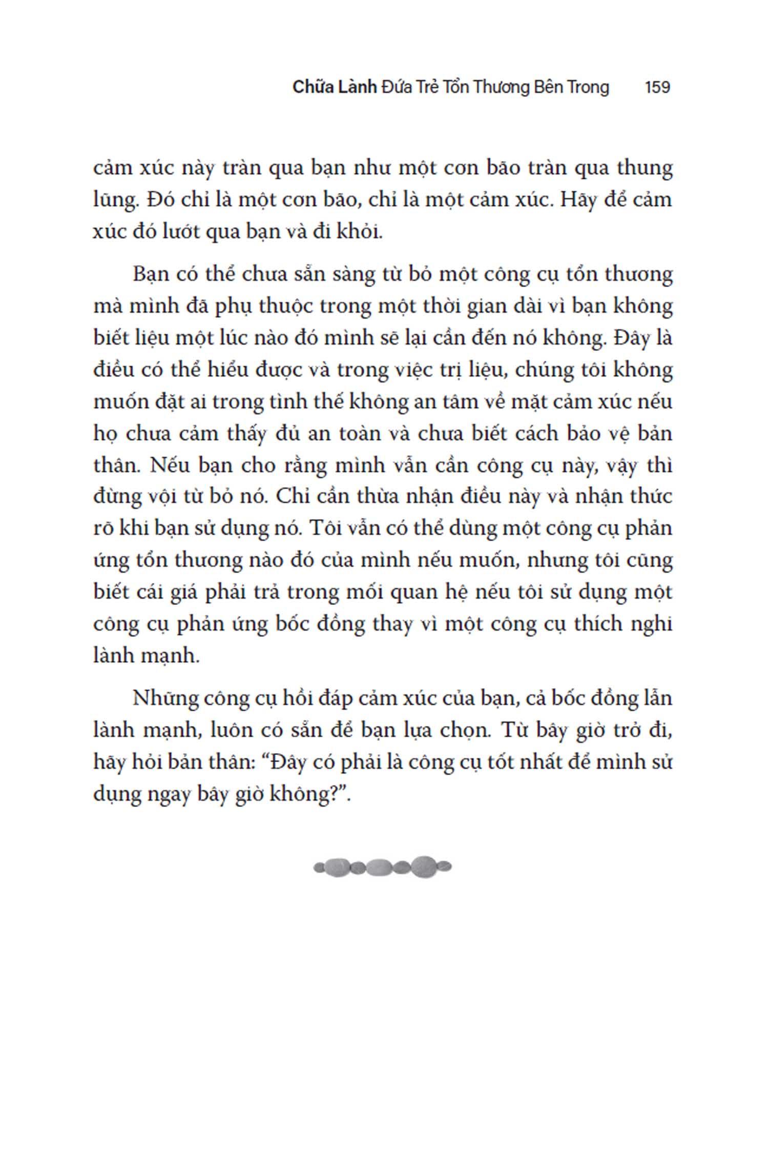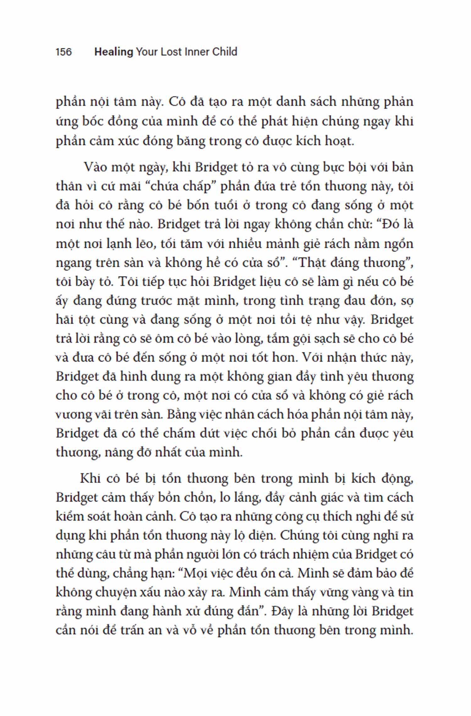 Thông qua các bài tập và câu chuyện của những người đã được chữa lành cũng như của chính tác giả, cuốn sách hướng dẫn làm thế nào để thấu hiểu “đứa trẻ tổn thương” bên trong chính m.ình và cách để kết nối phần nội tâm này với “phần trưởng thành”. Chẳng hạn như nhìn lại dòng sự kiện thời thơ ấu, viết thư trao đổi giữa phần trưởng thành và phần tổn thương, liên hệ những phản ứng bốc đồng trong hiện tại với nguyên nhân trong quá khứ… Việc viết những lá thư chữa lành qua lại với chính m.ình là một cách tuyệt vời để nhanh chóng làm bộc lộ những cảm xúc và kết nối với phần tổn thương bên trong bạn. Bạn đọc cũng sẽ hiểu cách mà “phần người lớn có trách nhiệm” có thể phát triển một bộ công cụ hồi đáp mới, tích cực hơn, thay thế cho những kiểu phản ứng cũ của đứa trẻ tổn thương bên trong.