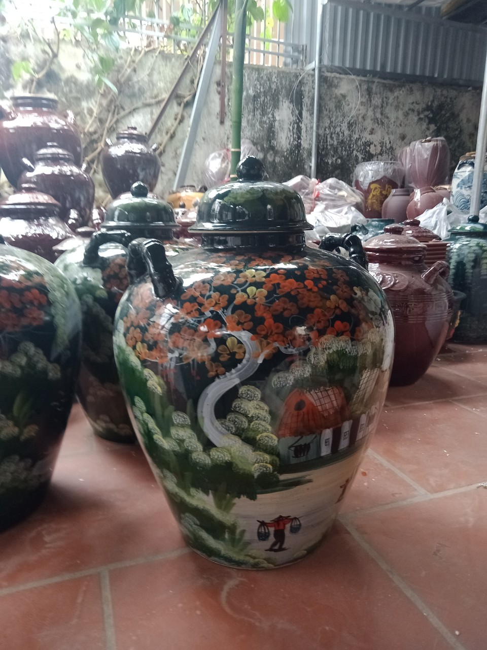 - Chum sứ men lam vẽ đồng quê có chiều cao 65 cm cả nắp, bụng rộng có đường kính 48 cm.