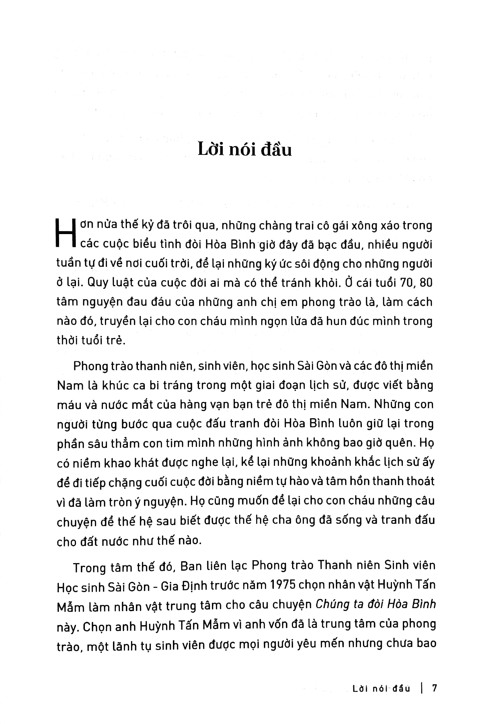 Sách ghi lại hồi ức của ông Huỳnh Tấn Mẫm, và các thành viên của Tổng hội Sinh viên Sài Gòn về phong trào đấu tranh đòi hòa bình của thanh niên, sinh viên, học sinh Sài Gòn trong giai đoạn 1969 - 1975.