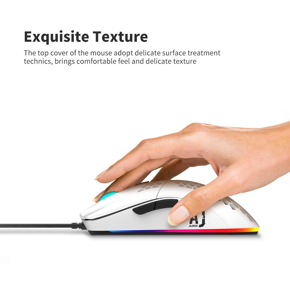 Features: High-precision Optical Sensor This mouse adopt high-precision PixArt PAW3338 optical sensor, with high sensitivity of 16000DPI, 12000fps scan rate, 1000Hz polling rate, able to withstand 40G acceleration and 400IPS movement speed, which can meet your needs of fast web browsing and gaming. Symmetrical Ergonomic Design Adopt symmetrical ergonomic design, suitable for left or right hands and different holding positions, more flexible and comfortable, and will not fatigue after long-term use. Hollowed-out Honeycomb Design This design meets the ventilation and cooling effect required by the game player for a long time playing, avoids the feeling of hot hands and palms during the game. It also has a cool visual appearance. Exquisite Texture The top cover of the mouse adopt delicate surface treatment technics, brings comfortable feel and delicate texture. Lightweight Design The net weight of this is about 69g, which can reduce the burden of hand, easy to control, provide smooth operation. Plug and Play Powered by USB, plug and play, no driver required, convenient to use. Specification: Item name: Wired mouse Brand: Ajazz Model: AJ390 Color: Black/White(optional) Image sensor: PAW3338 Number of keys: 7 Rate of return: 125Hz-1000Hz Acceleration: 40G Movement speed: 400IPS Support OS: Windows 2000/XP/Vista/Win7/Win8/win10/Mac Item size: 12.9 6.7 3.8cm /5.08 2.64 1.5in(L W H) Item weight: Approx.69g /2.43oz Packing list: 1 Wired mouse 1 User manual