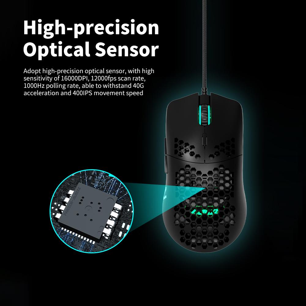 Features: High-precision Optical Sensor This mouse adopt high-precision PixArt PAW3338 optical sensor, with high sensitivity of 16000DPI, 12000fps scan rate, 1000Hz polling rate, able to withstand 40G acceleration and 400IPS movement speed, which can meet