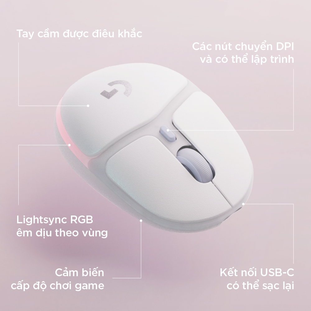 THÔNG SỐ KỸ THUẬT - Chiếu sáng RGB LIGHTSYNC (ba vùng) và kết nối Bluetooth - Sáu nút có thể lập trình Các nút bên chuyển DPI và có thể lập trình - DPI: 100 – 8.200 DPI - Thời lượng pin 40 giờ khi bật RGB có thể sạc lại qua kết nối USB-C - Kích thước: Chiều cao: 39,4 mm Chiều rộng: 68,1 mm Chiều dày: 105,8 mm - Trọng lượng chuột: 85 Gram - Phần mềm hỗ trợ: G HUB, có sẵn tại trang chủ LogitechG