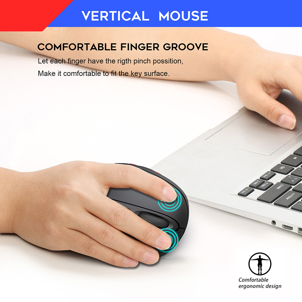 Description: This wireless vertical mouse adopts ergonomic design,comfortable finger groove,lets each finger have the right pinch possition,make it comfortable to fit the key surface.The ergonomic design helps you get rid of tireness after long use