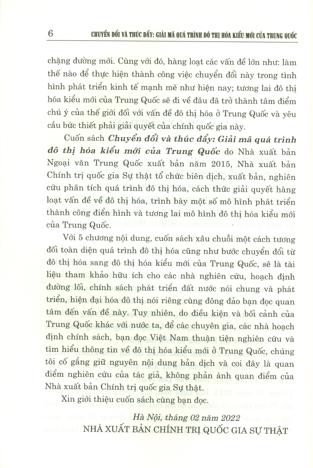Phân tích quá trình đô thị hóa, làm rõ cách thức giải quyết hàng loạt vấn đề bức thiết về đô thị hóa, trình bày một số mô hình phát triển thành công điển hình và tương lai mô hình đô thị hóa kiểu mới của Trung Quốc, cuốn sách Chuyển đổi và thúc đẩy: Giải mã quá trình đô thị hóa kiểu mới của Trung Quốc xâu chuỗi một cách tương đối toàn diện quá trình đô thị hóa cũng như bước chuyển đổi từ đô thị hóa sang đô thị hóa kiểu mới của Trung Quốc. Mặc dù điều kiện và bối cảnh của Việt Nam có những điểm khác với Trung Quốc, song đô thị hóa là hiện tượng, là quá trình tất yếu phải trải qua trong quá trình phát triển đất nước, do vậy, cuốn sách là tài liệu tham khảo hữu ích cho các nhà nghiên cứu, hoạch định chính sách phát triển đất nước nói chung và phát triển, hiện đại hóa đô thị nói riêng cùng đông đảo bạn đọc quan tâm đến vấn đề này.