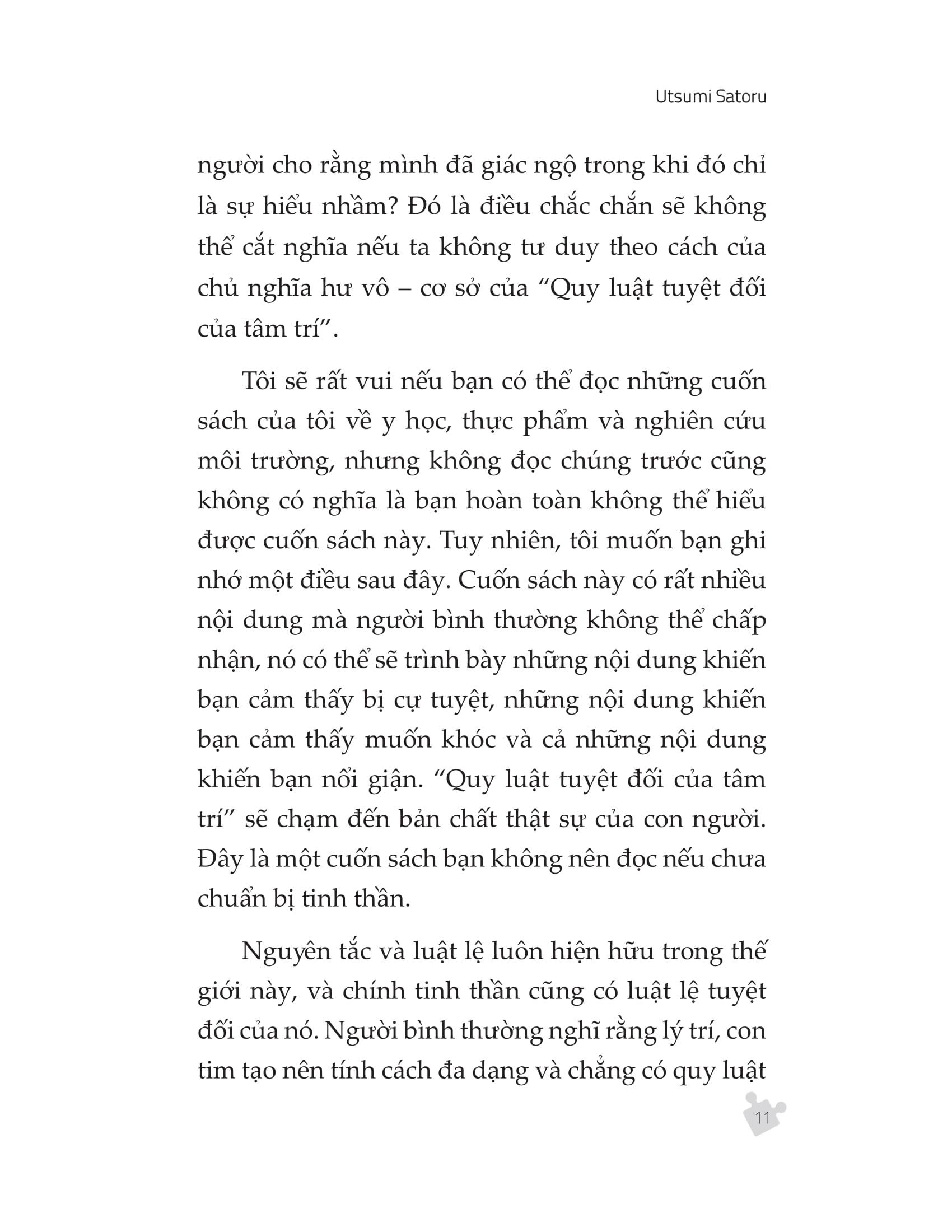 - Phần ứng dụng: từ chương 11 đến chương 18: Bàn về tác động của các quy luật tuyệt đối của tâm trí đến các lĩnh vực gần gũi trong cuộc sống như y học, kinh doanh, làm cha mẹ… từ đó rút ra những nhận định đáng giá về khả năng chuyển hóa tâm thức thông qua các quy luật tuyệt đối của tâm trí. Nội dung cuốn sách bàn về những nguồn cơ gây ra các cảm xúc tiêu cực khác nhau, mong muốn kiểm soát chúng của mỗi chúng ta thông qua hành vi phản ứng, phụ thuộc thậm chí là tâm lý giả làm nạn nhân. Qua đó tác giả sẽ cho chúng ta biết tại sao chúng ta lại có những cảm xúc tiêu cực như thế, và chúng ảnh hưởng như thế nào đến cơ thể, tạo ra bệnh tật và gây bối rối trong đời sống công việc lẫn cá nhân của chúng ta. Ngoài ra, ông cũng truy nguyên những tiêu cực này về các quy luật tuyệt đối của tâm trí, hướng dẫn chúng ta cách đối phó với những sự thật đã tạo ra vấn đề để tìm về một cuộc sống an lạc và hạnh phúc. Điểm mới mẻ trong cuốn sách này là tác giả tiếp cận vấn đề theo hướng quy nạp, đi từ kết quả, phân tích kết quả và tìm ra nguyên nhân. Từ đó, biết cách trang bị cho mình những “biện pháp” phòng bị dựa trên trải nghiệm. Với lối viết ngắn gọn và súc tích, Utsumi Satoru sẽ cung cấp cho độc giả những bí kíp thay đổi thái độ, chuyển hóa tâm thức thực sự hữu ích để có thể sắp xếp cuộc sống một cách tốt nhất.