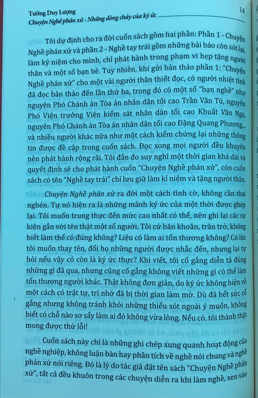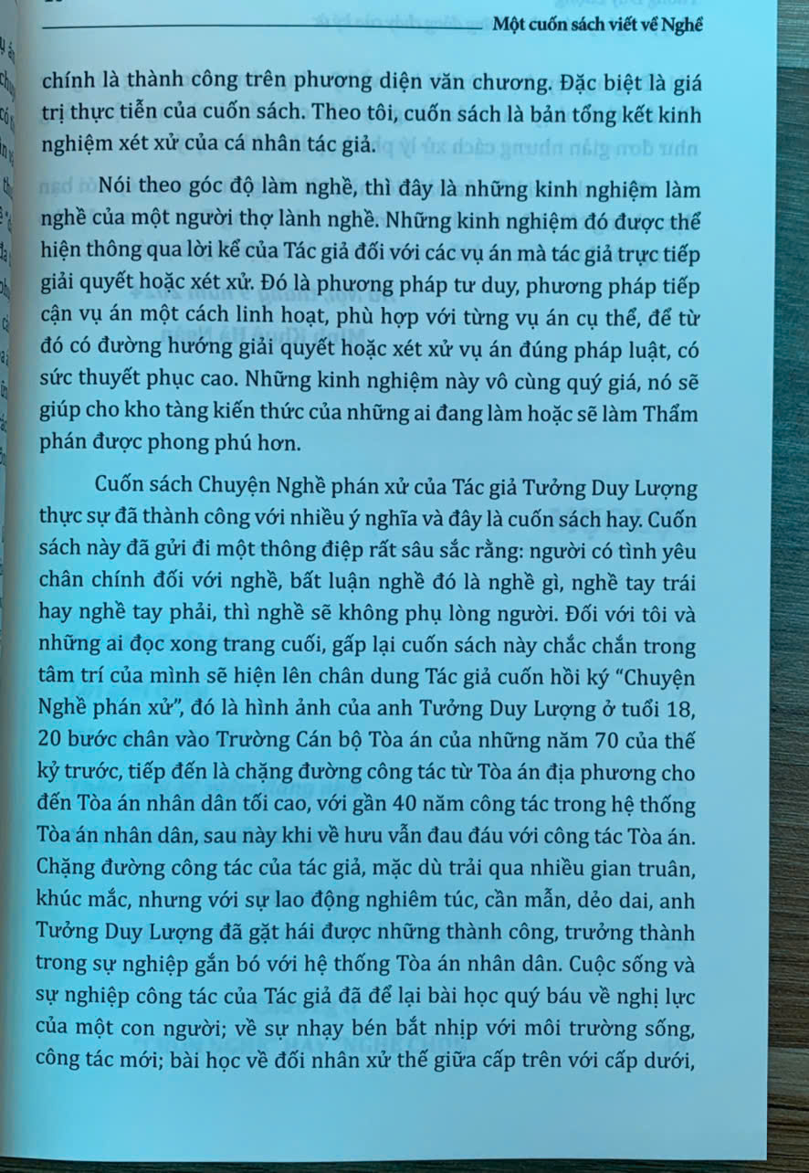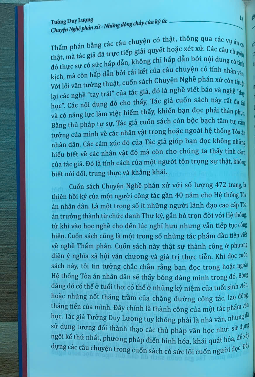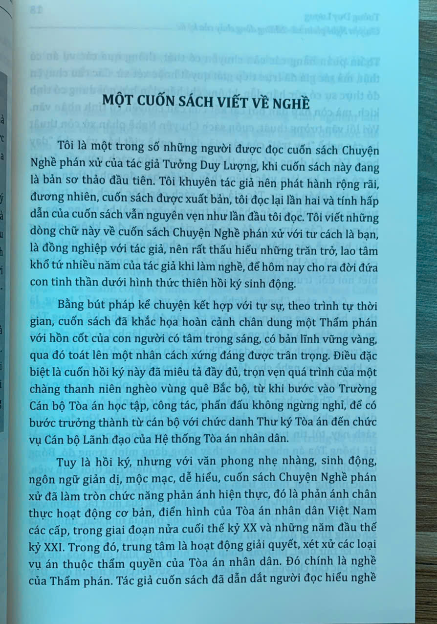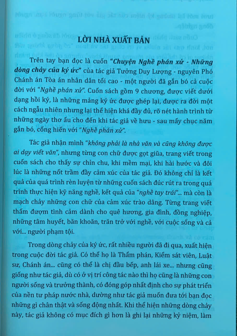 Trên tay bạn đọc là cuốn “Chuyện Nghề phán xử - Những dòng chảy của ký ức” của tác giả Tưởng Duy Lượng - nguyên Phó Chánh án Tòa án nhân dân tối cao - một người đã gắn bó cả cuộc đời với “Nghề phán xử”. Cuốn sách gồm 9 chương, được viết dưới dạng hồi ký, là những mảng ký ức được ghép lại, được ra đời một cách ngẫu nhiên nhưng lại thể hiện khá đầy đủ, rõ nét hành trình từ những ngày thơ ấu cho đến khi tác giả về hưu - sau mấy chục năm gắn bó, cống hiến với “Nghề phán xử”.