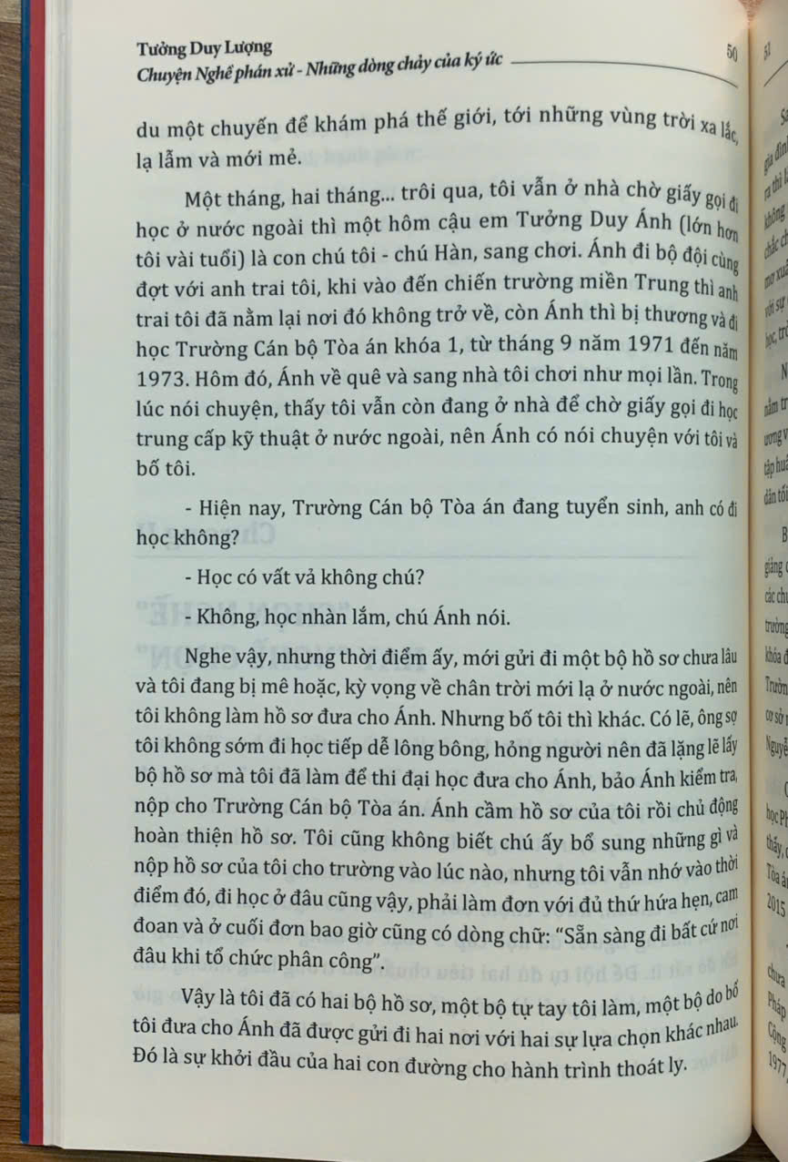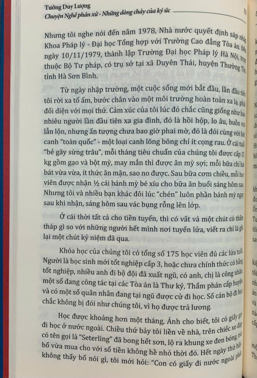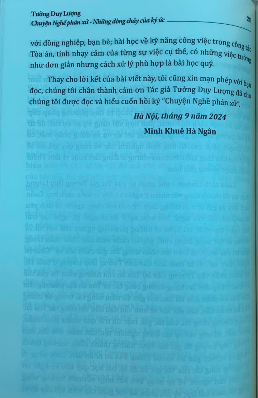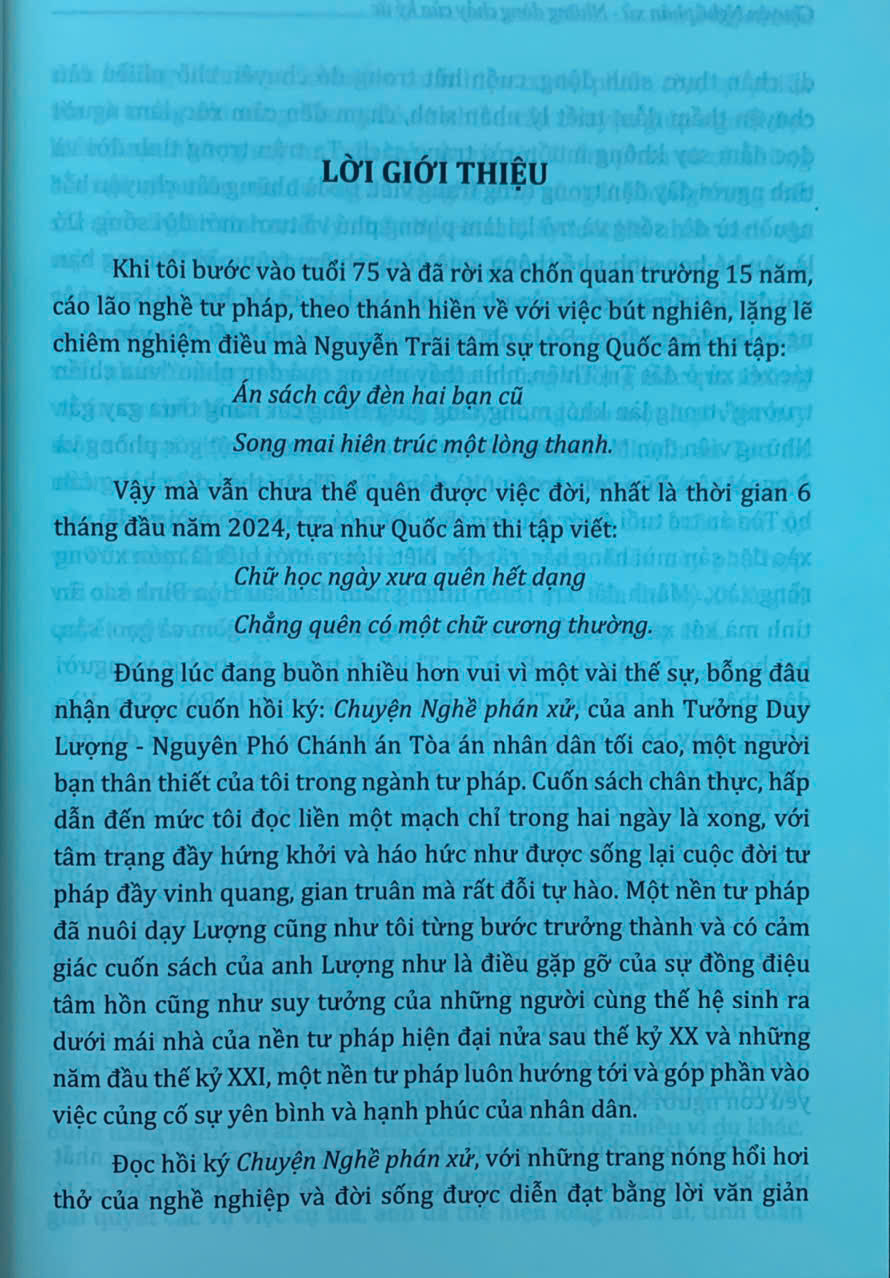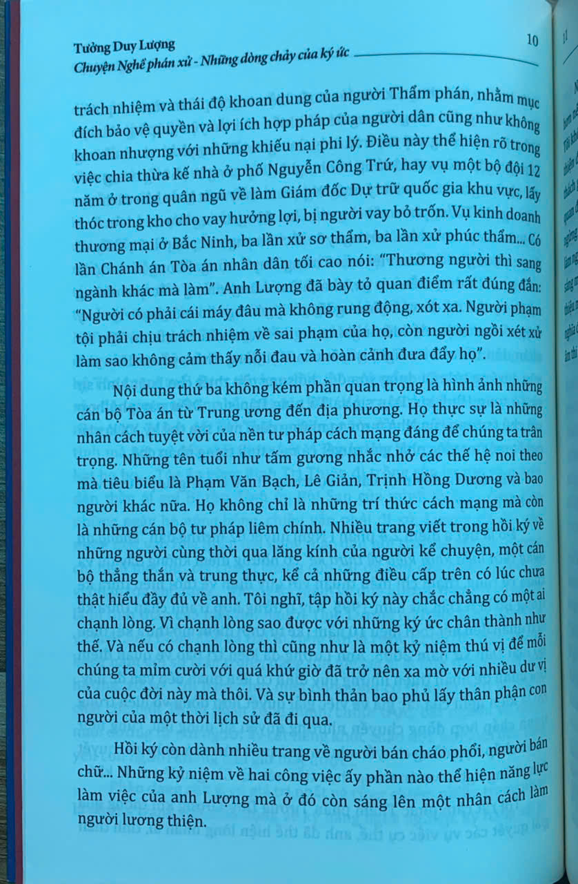 Trên tay bạn đọc là cuốn “Chuyện Nghề phán xử - Những dòng chảy của ký ức” của tác giả Tưởng Duy Lượng - nguyên Phó Chánh án Tòa án nhân dân tối cao - một người đã gắn bó cả cuộc đời với “Nghề phán xử”. Cuốn sách gồm 9 chương, được viết dưới dạng hồi ký, là những mảng ký ức được ghép lại, được ra đời một cách ngẫu nhiên nhưng lại thể hiện khá đầy đủ, rõ nét hành trình từ những ngày thơ ấu cho đến khi tác giả về hưu - sau mấy chục năm gắn bó, cống hiến với “Nghề phán xử”.