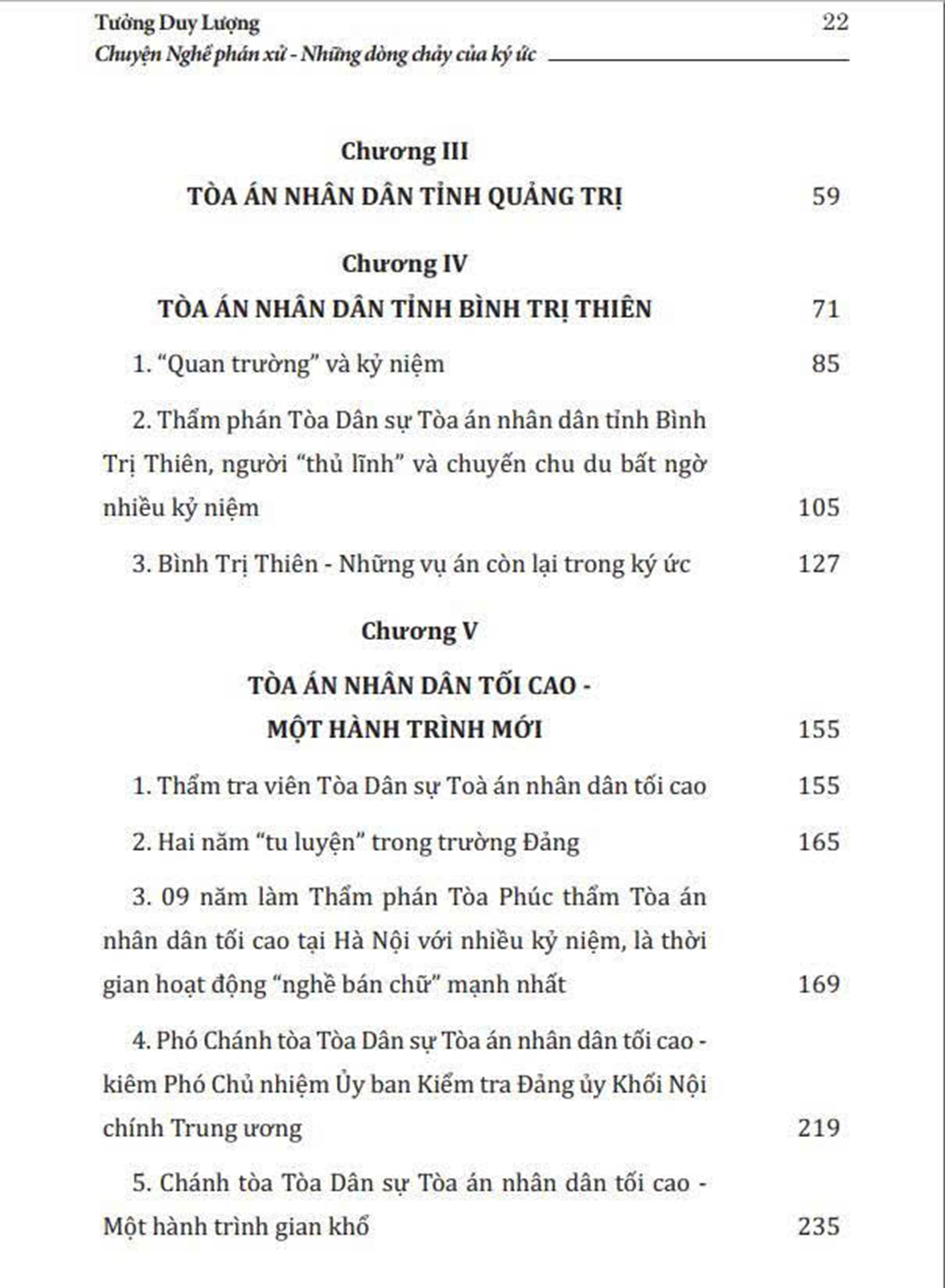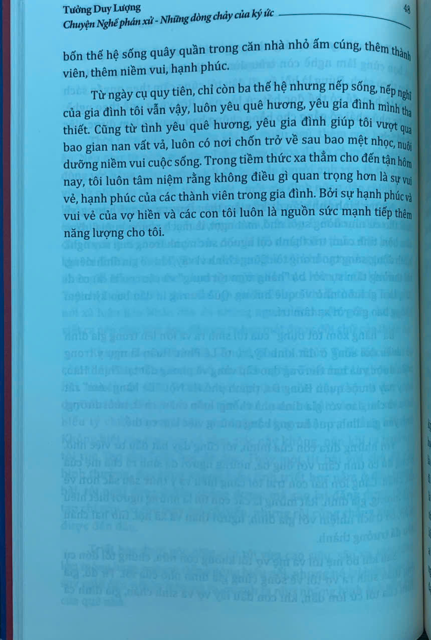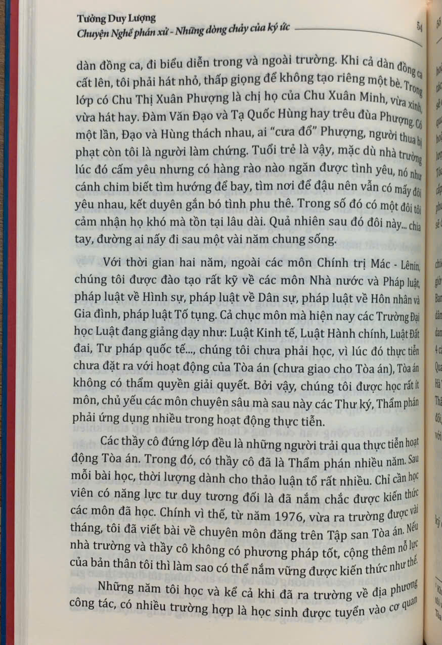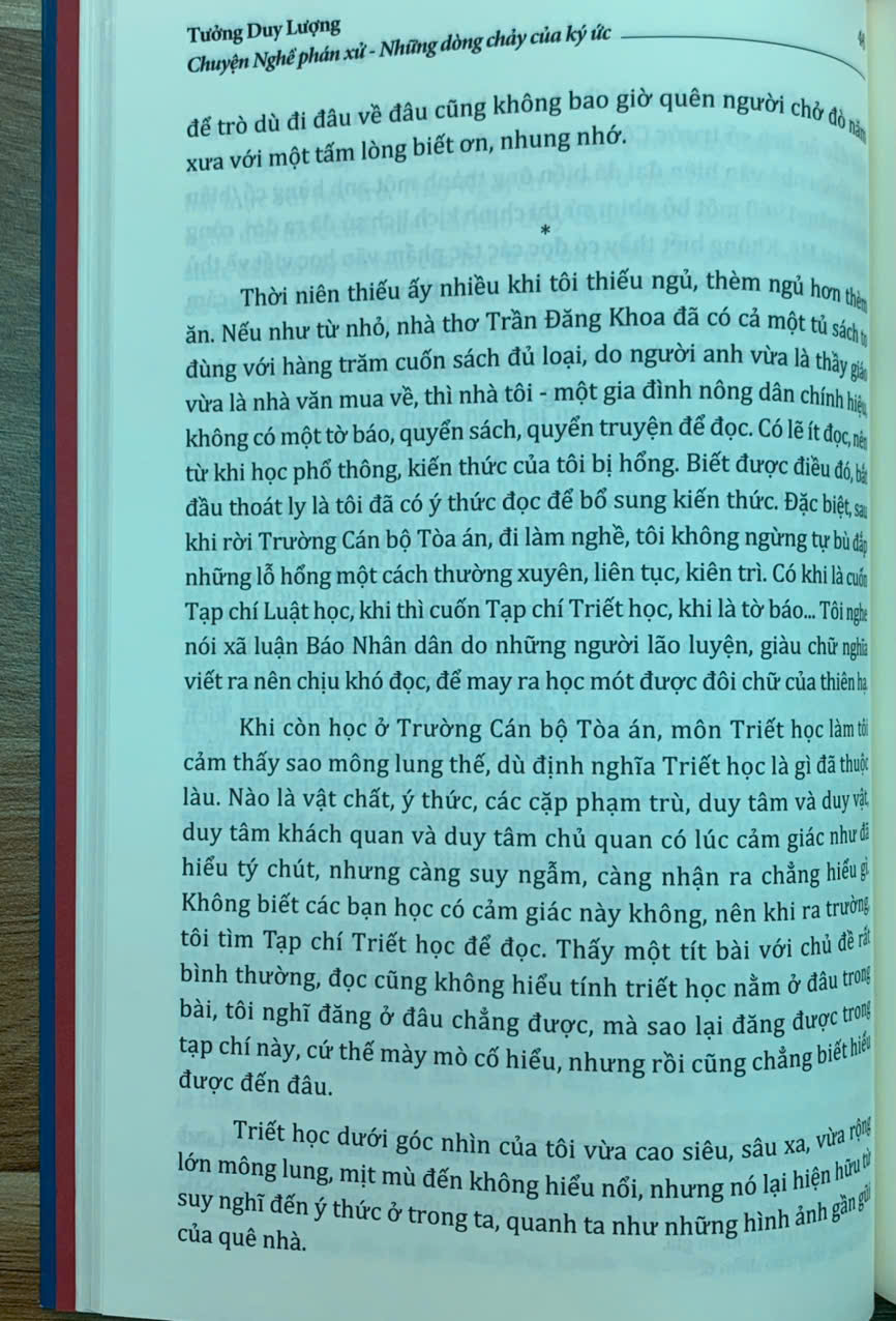 Trên tay bạn đọc là cuốn “Chuyện Nghề phán xử - Những dòng chảy của ký ức” của tác giả Tưởng Duy Lượng - nguyên Phó Chánh án Tòa án nhân dân tối cao - một người đã gắn bó cả cuộc đời với “Nghề phán xử”. Cuốn sách gồm 9 chương, được viết dưới dạng hồi ký, là những mảng ký ức được ghép lại, được ra đời một cách ngẫu nhiên nhưng lại thể hiện khá đầy đủ, rõ nét hành trình từ những ngày thơ ấu cho đến khi tác giả về hưu - sau mấy chục năm gắn bó, cống hiến với “Nghề phán xử”.