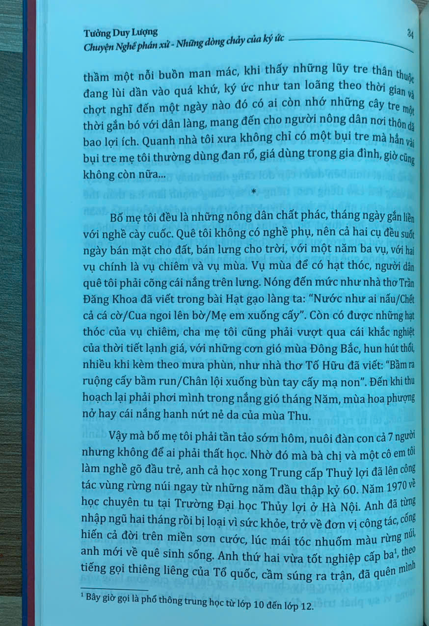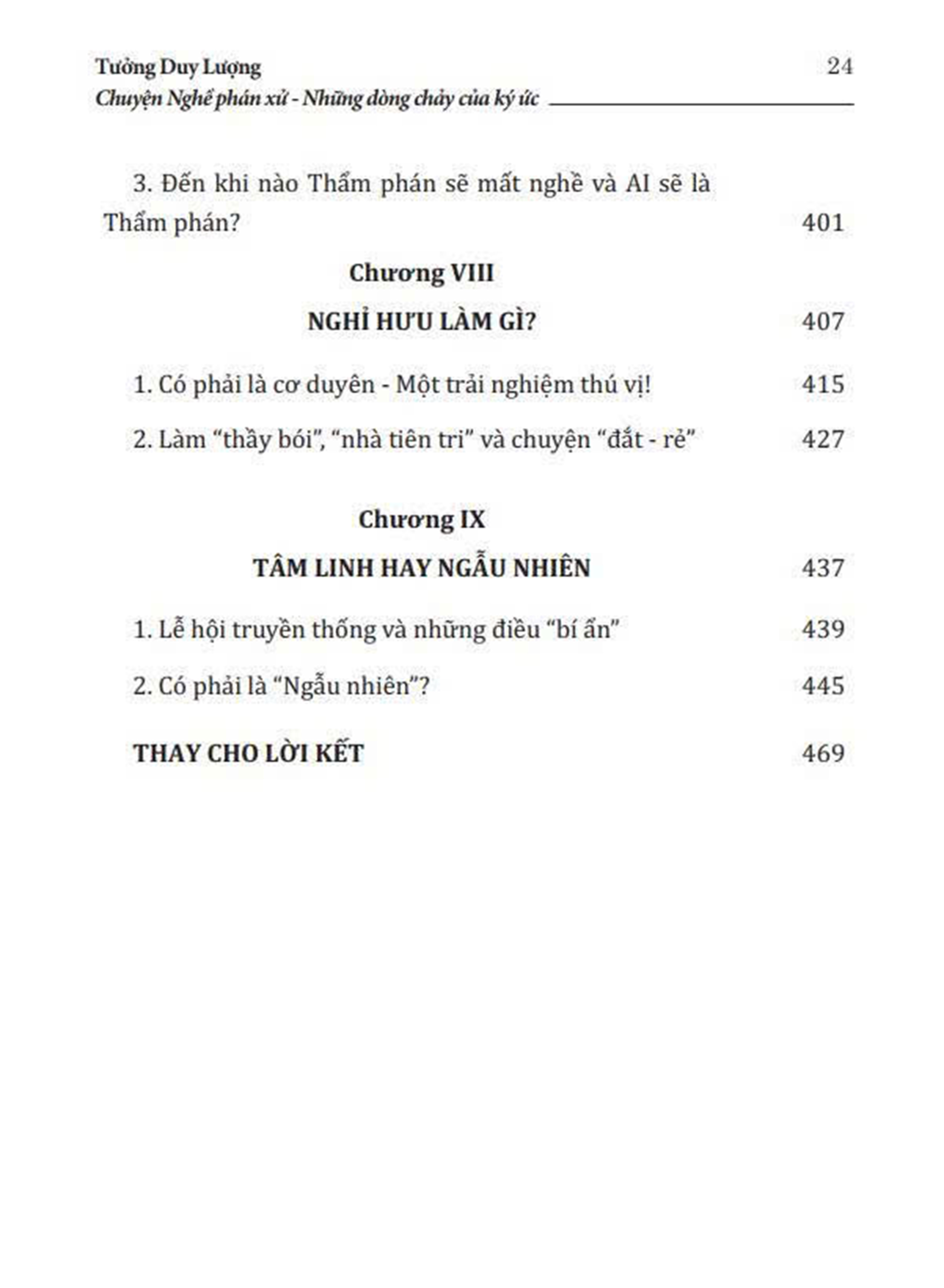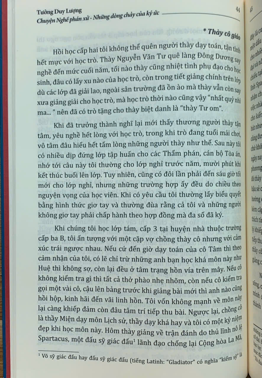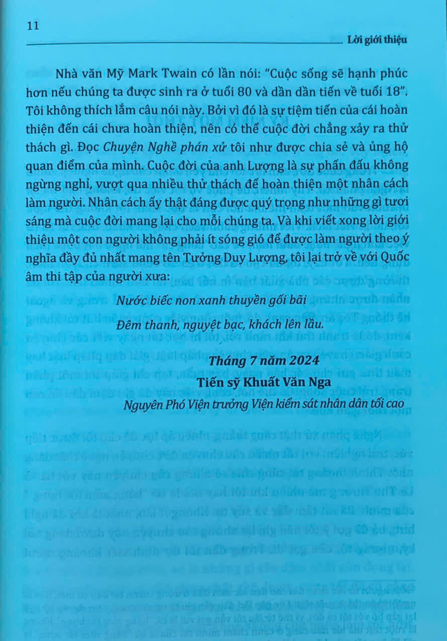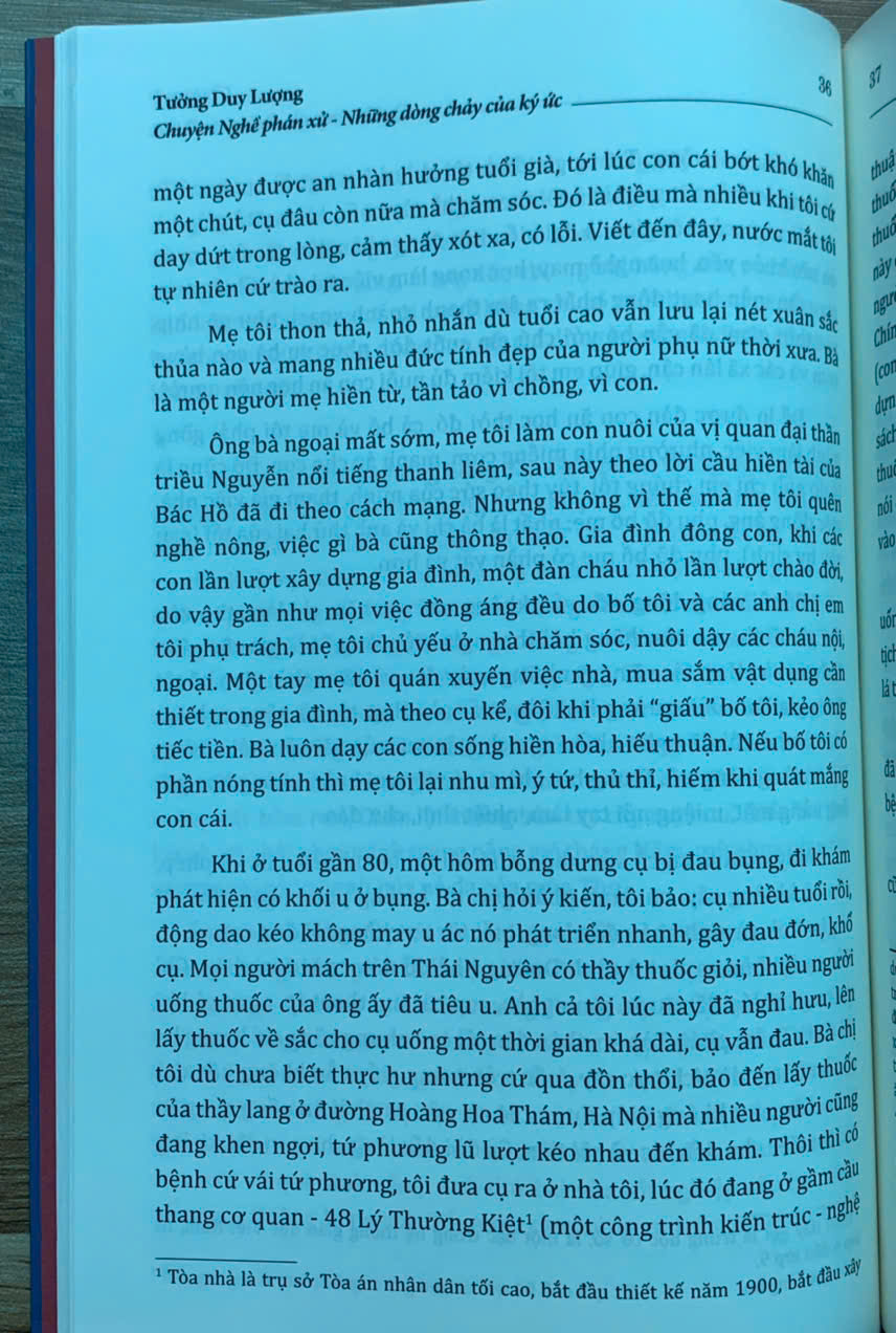 Trên tay bạn đọc là cuốn “Chuyện Nghề phán xử - Những dòng chảy của ký ức” của tác giả Tưởng Duy Lượng - nguyên Phó Chánh án Tòa án nhân dân tối cao - một người đã gắn bó cả cuộc đời với “Nghề phán xử”. Cuốn sách gồm 9 chương, được viết dưới dạng hồi ký, là những mảng ký ức được ghép lại, được ra đời một cách ngẫu nhiên nhưng lại thể hiện khá đầy đủ, rõ nét hành trình từ những ngày thơ ấu cho đến khi tác giả về hưu - sau mấy chục năm gắn bó, cống hiến với “Nghề phán xử”.