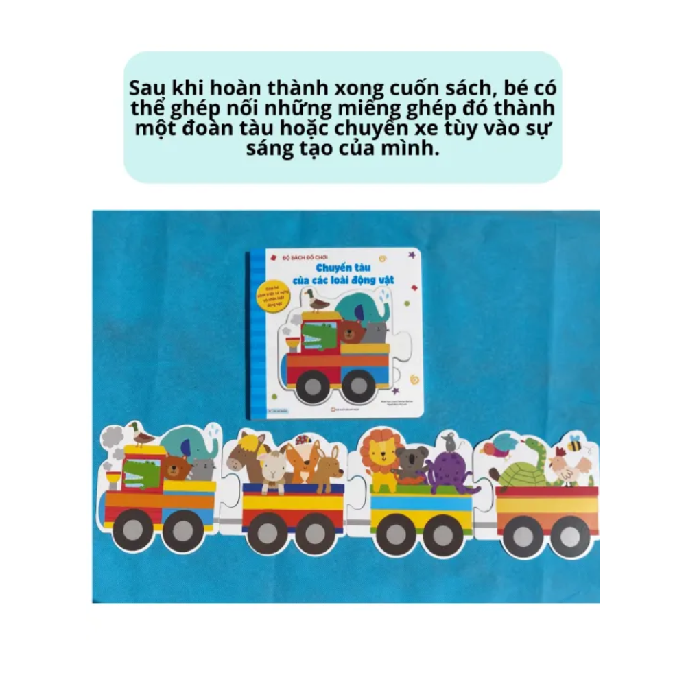 Đây là bộ sách màu sắc/động vật vô cùng thú vị, giúp bé vừa học vừa chơi mà không hề nhàm chán. Mỗi cuốn sách gồm có 8 trang hình ảnh màu, trong đó 4 trang từ vựng song ngữ Anh – Việt xen kẽ với 4 trang chứa miếng ghép hình sinh động, đáng yêu. Sau khi hoàn thành xong cuốn sách, bé có thể ghép nối những miếng ghép đó thành một đoàn tàu hoặc chuyến xe tùy vào sự sáng tạo của mình.