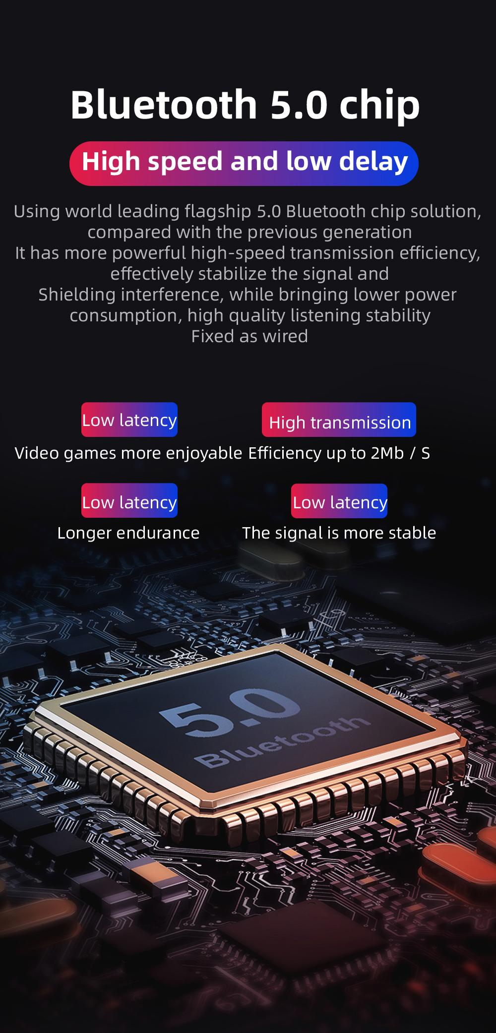 Features: Adopt DSP anti-interference chip and BT5.0 chip, fast and stable transmission, low power consumption. High-quality eight-core 13mm speaker unit, good sound quality, comfortable audio experience. CVC intelligent noise reduction technology can automatically reduct environmental