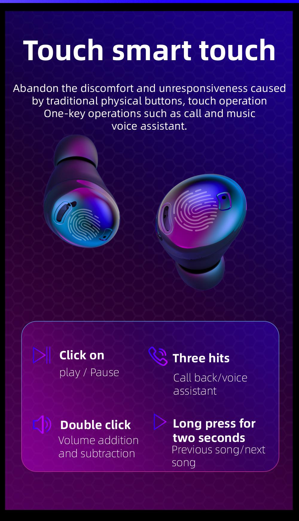 Features: BT 5.0 brings high data transfer speed, no latency, stable connection and low power consumption. Multi-functional Touch control let you answer/reject calls, play/pause songs, wake up voice assistant, by touching these in-ear wireless headphones