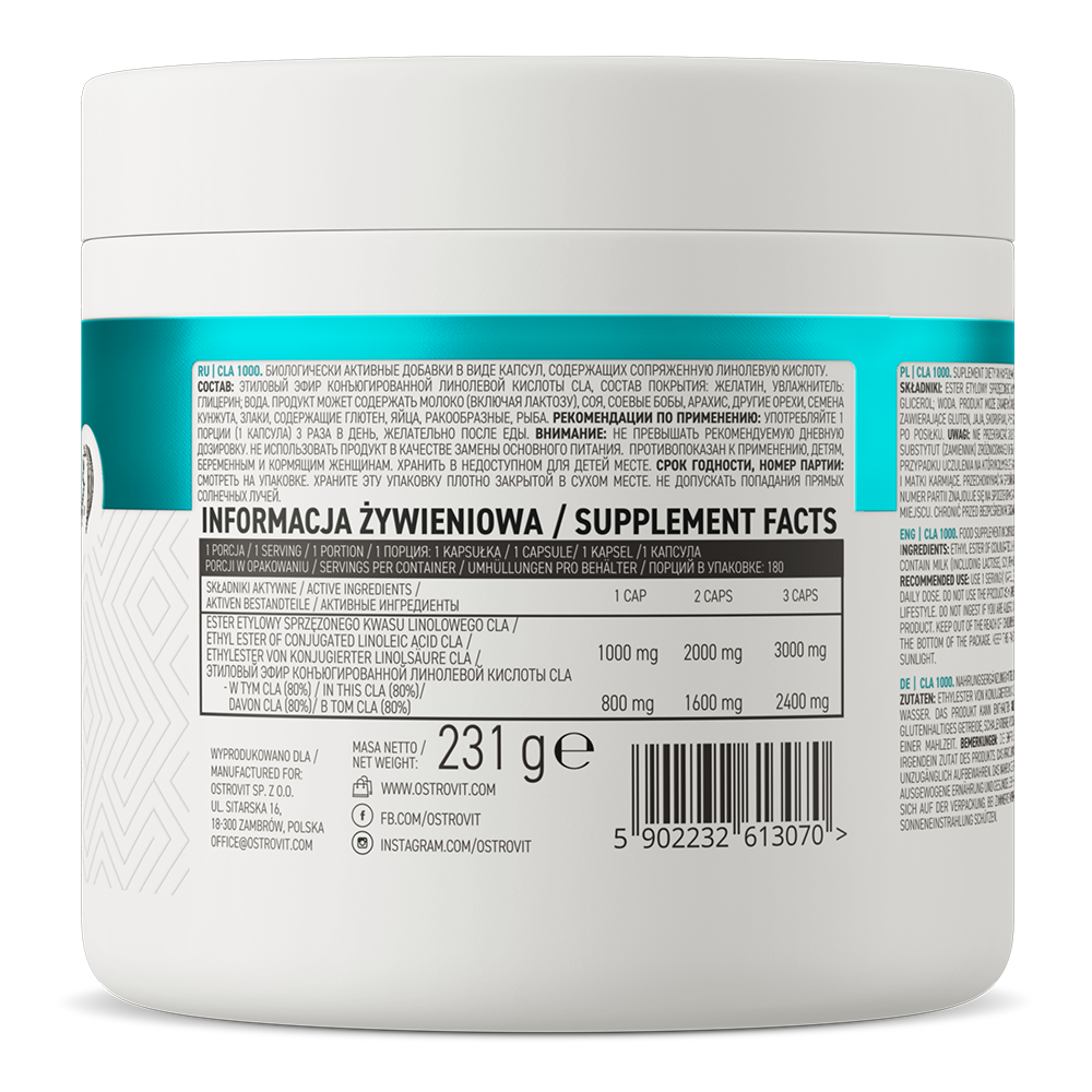 Mua tại TiktokOstroVit CLA 1000 mg 180 viên OstroVit CLA 1000 là thực phẩm bổ sung chất lượng cao nhất có chứa axit linoleic liên hợp (CLA). CLA có tác dụng rất tích cực đối với cơ thể con người. Nó cho thấy một hoạt động hỗ trợ sự phát triển của khối lượng cơ nạc và giúp đốt cháy các mô mỡ dư thừa.