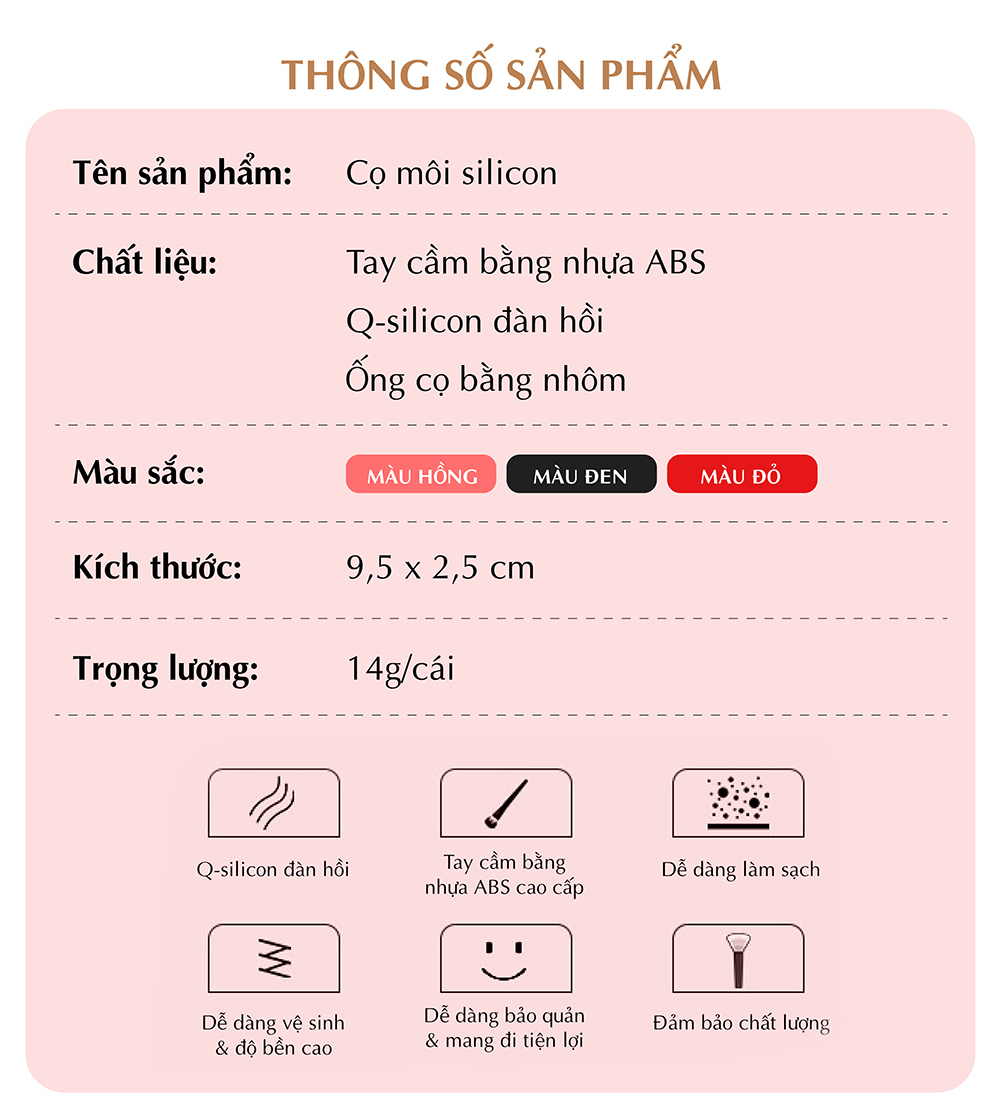 - Chất liệu: làm bằng chất liệu silicon cao cấp mềm mại, an toàn cho làn môi của bạn, đảm bảo cảm giác thoải mái nhất khi sử dụng sản phẩm này. Tay cầm của cọ được làm bằng nhựa chắc chắn và dễ dàng cầm nắm. Cọ kèm theo nắp bằng nhôm giúp bảo vệ đầu cọ và luôn sạch sẽ sau khi sử dụng.