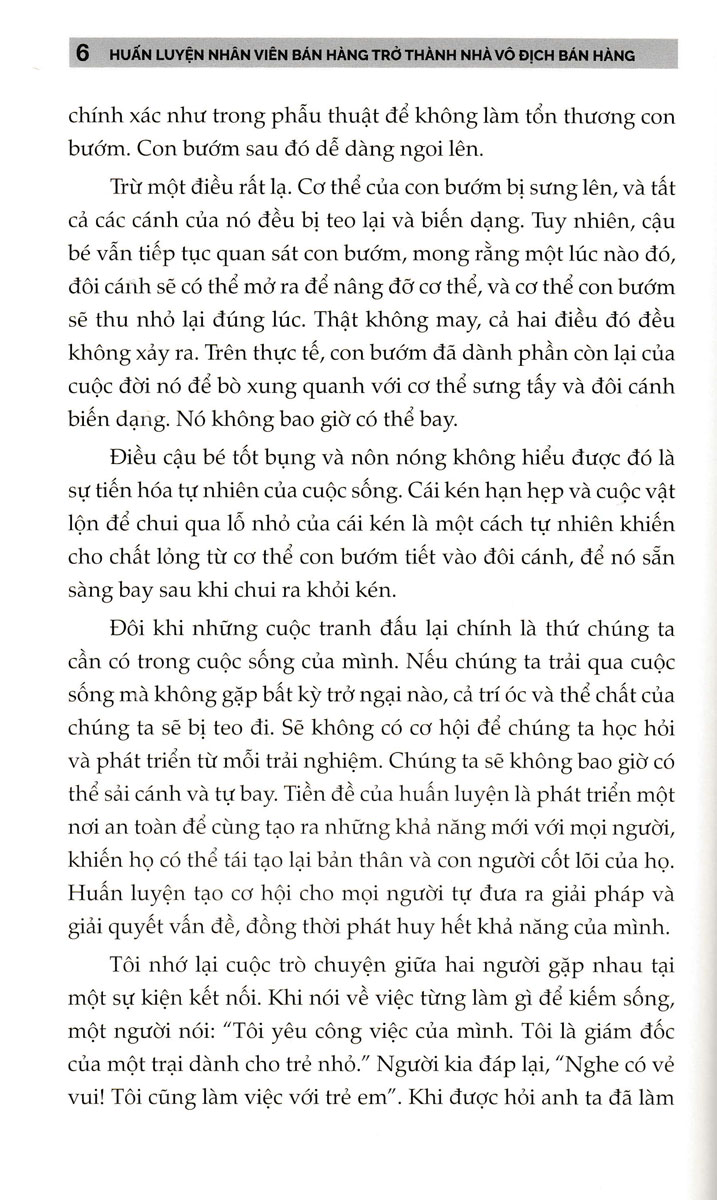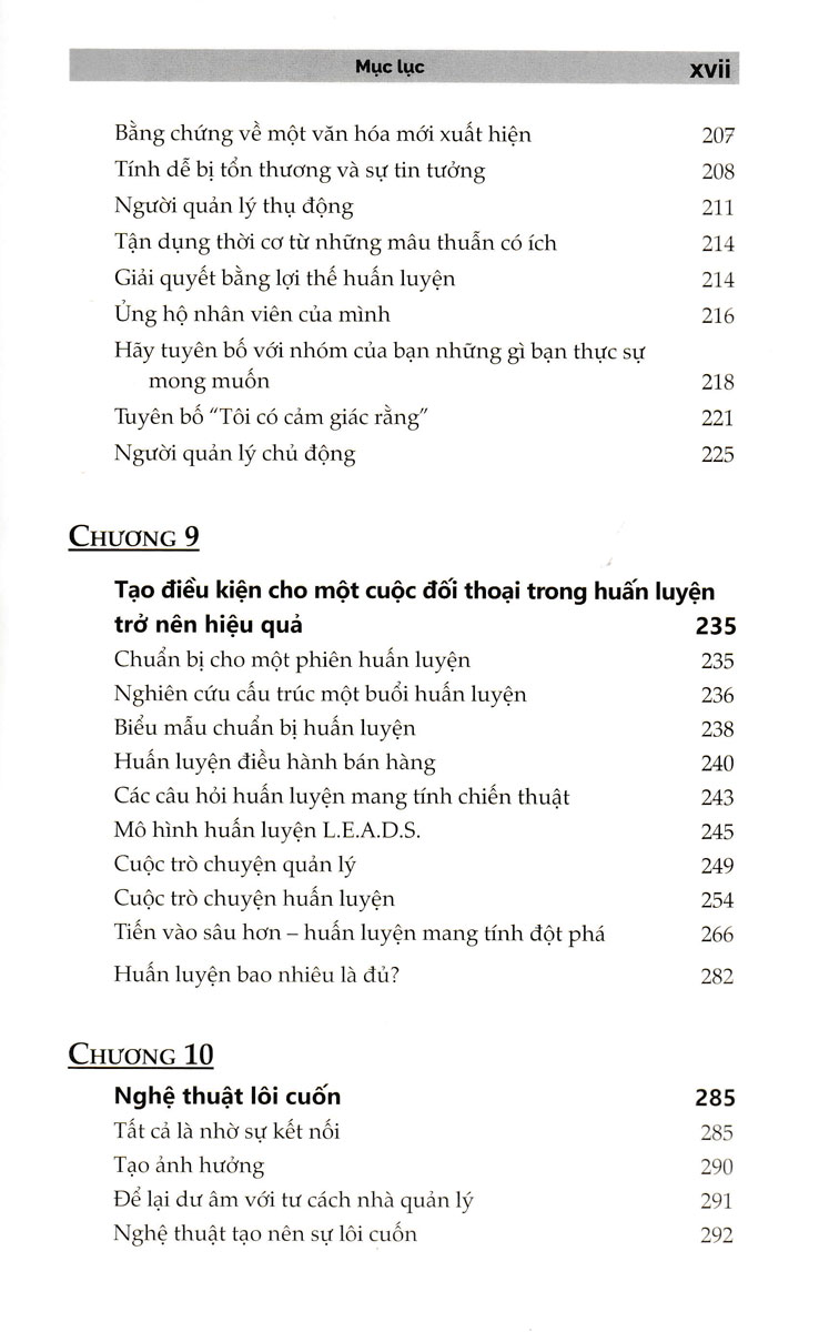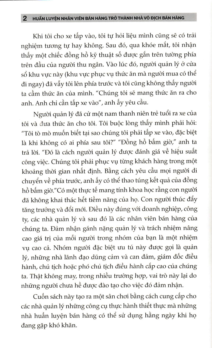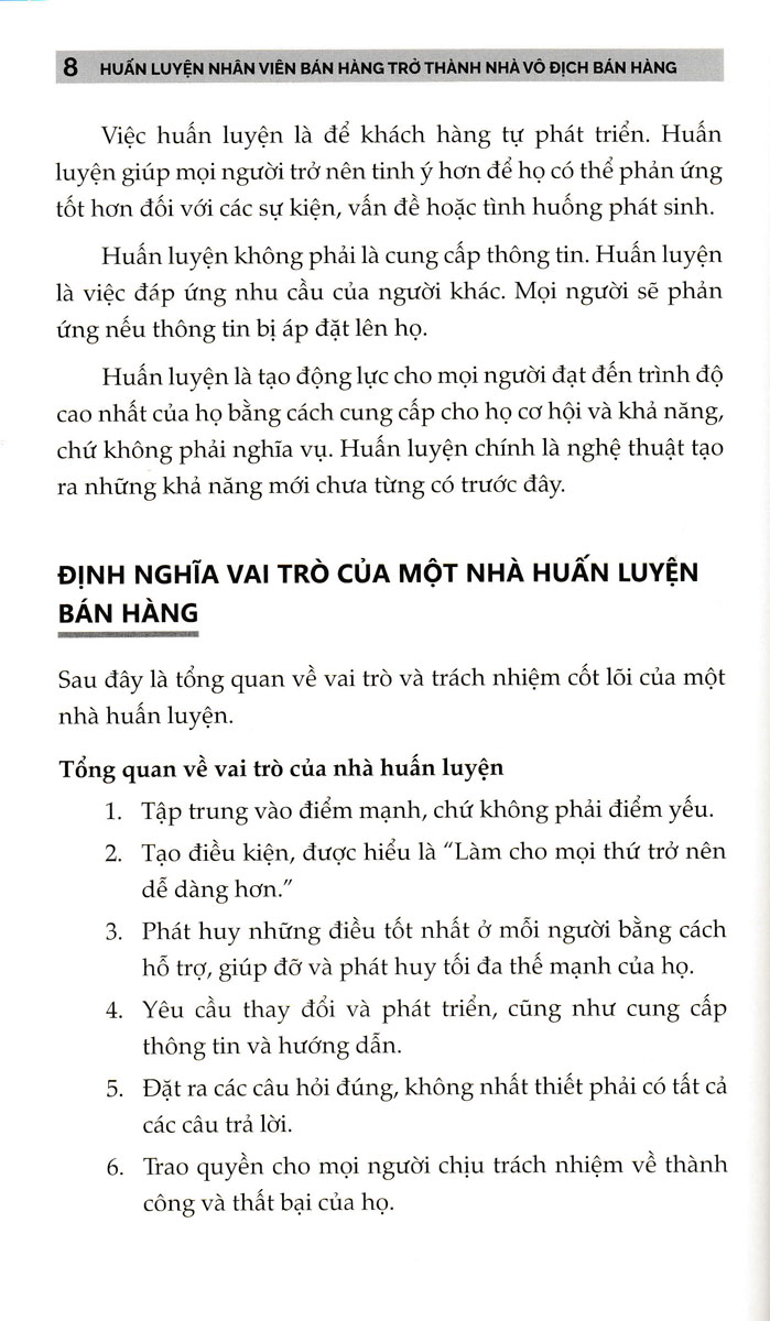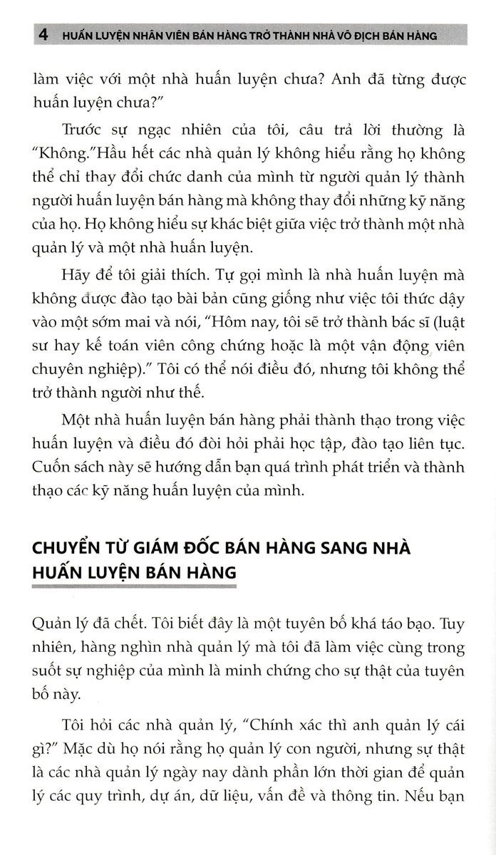 Coaching Salespeople Into Sales Champions - Huấn Luyện Nhân Viên Bán Hàng Trở Thành Nhà Vô Địch Bán Hàng     Quyển sách Huấn Luyện Nhân Viên Bán Hàng Trở Thành Nhà Vô Địch Bán Hàng là một tác phẩm được trao 5 giải thưởng quốc tế dành cho Sách hay nhất và là cuốn sách quản lý bán hàng bán chạy nhất trên trong năm năm liên tiếp. Bằng việc sử dụng phương pháp huấn luyện của Keith Rosen - phương pháp được sử dụng bởi những tổ chức hàng đầu thế giới và với khung huấn luyện L.E.A.D.S - các giám đốc điều hành, các quản lý nhân sự - sẽ giúp đội ngũ quản lý và bán hàng của m.ình đạt kết quả hoạt động tốt hơn - nhanh hơn. Cuốn sách này bao gồm các nghiên cứu điển hình, chiến lược xoay chuyển tình thế trong 30 ngày dành cho những người làm việc kém hiệu quả, một thư viện gồm các biểu mẫu và kịch bản huấn luyện, cũng như hàng trăm câu hỏi huấn luyện mạnh mẽ. Bạn có thể sử dụng ngay lập tức để huấn luyện bất kỳ ai trong mọi tình huống. Huấn Luyện Nhân Viên Bán Hàng Trở Thành Nhà Vô Địch Bán Hàng là cẩm nang của bạn để tạo ra một nền văn hóa huấn luyện tiến bộ và xây dựng đội ngũ những nhân viên hàng đầu .