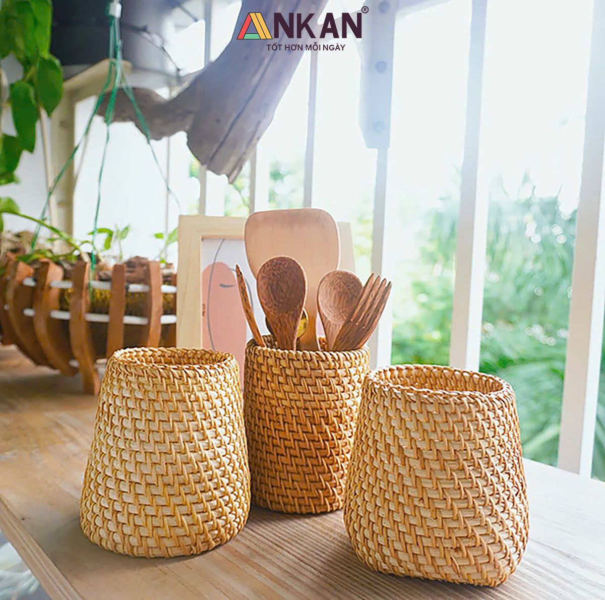 Cốc mây tự nhiên dùng để đựng bút và đồ dùng văn phòng