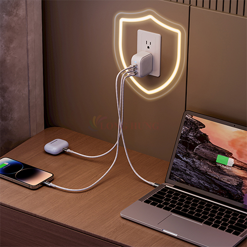- Trang bị 3 cổng sạc (2 Type + 1 USB) cho phép sạc nhiều thiết bị cùng lúc