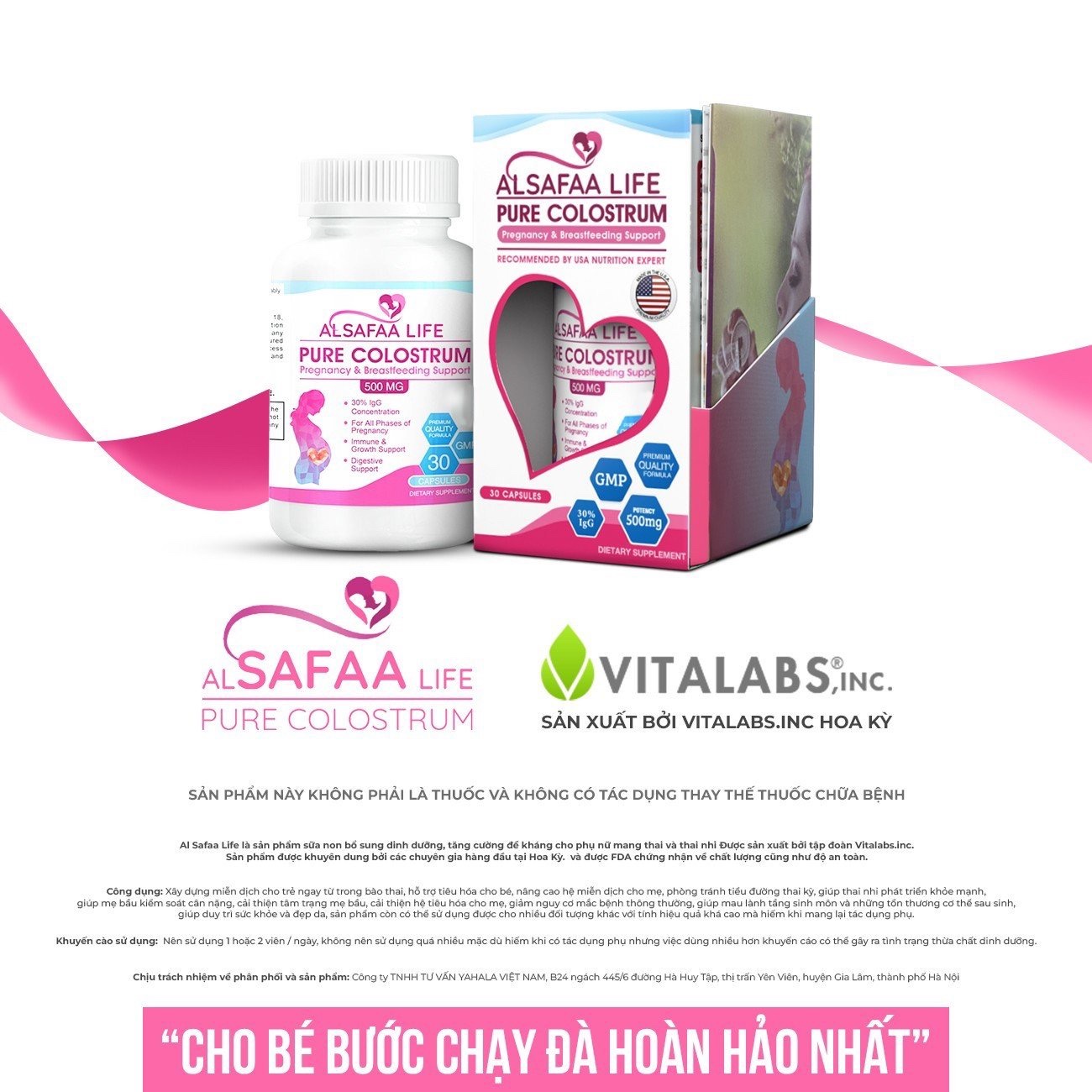 1 Mô tả sản phẩm: Thực phẩm bảo vệ sức khỏe Sữa non Al Safaa Life với hàm lượng cao các chất dinh dưỡng quan trọng như protein, vitamin, khoáng chất và yếu tố đề kháng. Đặc biệt, sữa non Al Safaa Life có hàm lượng IgG lên đến 30%, giúp tăng cường hệ miễn dịch và bảo vệ sức khỏe của mẹ bầu và thai nhi, hỗ trợ thai kỳ khỏe mạnh, bổ sung các chất dinh dưỡng, vitamin thiết yếu cho mẹ và bé trong suốt thai kỳ. Hỗ trợ phát triển hệ tiêu hóa cho bé. Năng cao hệ miễn dịch cho mẹ Hỗ trợ tránh tiểu đường thai kỳ Hỗ trợ Tăng trưởng thai kỳ Hỗ trợ mẹ bầu kiểm soát cân nặng, cải thiện tâm trạng mẹ bầu Tăng cường và phát triển khả năng miễn dịch và đề kháng cho bé Hỗ trợ khả năng phục hồi của mẹ sau sinh Góp phần duy trì sức khỏe và đẹp da 2 Quy cách sản phẩm: 1 Hộp với 30 viên con nhộng 3 Hướng dẫn sử dụng: Nên sử dụng từ 1 đến 2 viên/ngày 4 Đối tượng sử dụng Phụ nữ trước, trong và sau khi mang thai (có thể sử dụng cho những đối tượng khác như người già, người tập thể dục, ăn kiêng…) 5 Thành phần Trong mỗi viên con nhộng 605mg chứa: 500mg sữa non bò, trong đó chứa 30% IgG. Protein: Beta-lactoglobulin, Alpha-lactalbumin, Serum albumin, Immunoglobulins, Lactoferrin. Vitamin: Vitamin A (Retinol), Vitamin D (Cholecalciferol), Vitamin E (Tocopherol), Vitamin C (Ascorbic acid), Vitamin B1 (Thiamine), Vitamin B2 (Riboflavin), Vitamin B3 (Niacin), Vitamin B5 (Pantothenic acid), Vitamin B6 (Pyridoxine), Acid Folic (Folate), Vitamin B12 (Cobalamin), Vitamin B7 (Biotin) Khoáng chất dinh dưỡng: Calcium, Magnesium, Iron (Sắt), Zinc (Kẽm), Manganese (Mangan), Copper (Đồng), Selenium (Selen), Iodine (I-ốt), Phosphorus (Phốt pho), Potassium (Kali), Sodium (Natri), Chloride (Clo), Sulfur (Lưu huỳnh), Chromium (Crôm), Nickel (Niken), Cobalt (Coban), Fluoride (Fluorua), Vanadium (Vanađi), Silica (Silic), Tin (Thiếc). Carbohydrate và Chất béo: Lactose (Lactose), Triglycerides (Triglycerides), Phospholipids (Phospholipids), Oligosaccharides (Oligosaccharides), Polysaccharides (Polysaccharides), Starch (Tinh bột), Glycogen (Glycogen), Dextrin (Dextrin), Cellulose (Cellulose), Saturated fatty acids (Acid béo bão hòa, Unsaturated fatty acids (Acid béo không bão hòa), Monounsaturated fatty acids (Acid béo không bão hòa một lần), Polyunsaturated fatty acids (Acid béo không bão hòa nhiều lần), Trans fatty acids (Acid béo trans), Omega-3 fatty acids (Acid béo omega-3), Omega-6 fatty acids (Acid béo omega-6). Yếu tố đề kháng: Immunoglobulin G (IgG), Immunoglobulin A (IgA), Immunoglobulin M (IgM), Lactoferrin (Lactoferrin), Lysozyme (Lysozyme), Cytokines (Cytokines), Lactoperoxidase (Lactoperoxidase), Growth factors (Factors tăng trưởng), Epidermal Growth Factor (EGF), Insulin-like Growth Factor (IGF). 7 Bảo quản: Bảo quản trong lọ gài nắp kín, để nơi khô ráo, thoáng mát, nhiệt độ phòng, tránh ánh nắng trực tiếp từ mặt trời. Lưu Ý: Sản phẩm này không phải là thuốc và không có tác dụng thay thế thuốc chữa bệnh