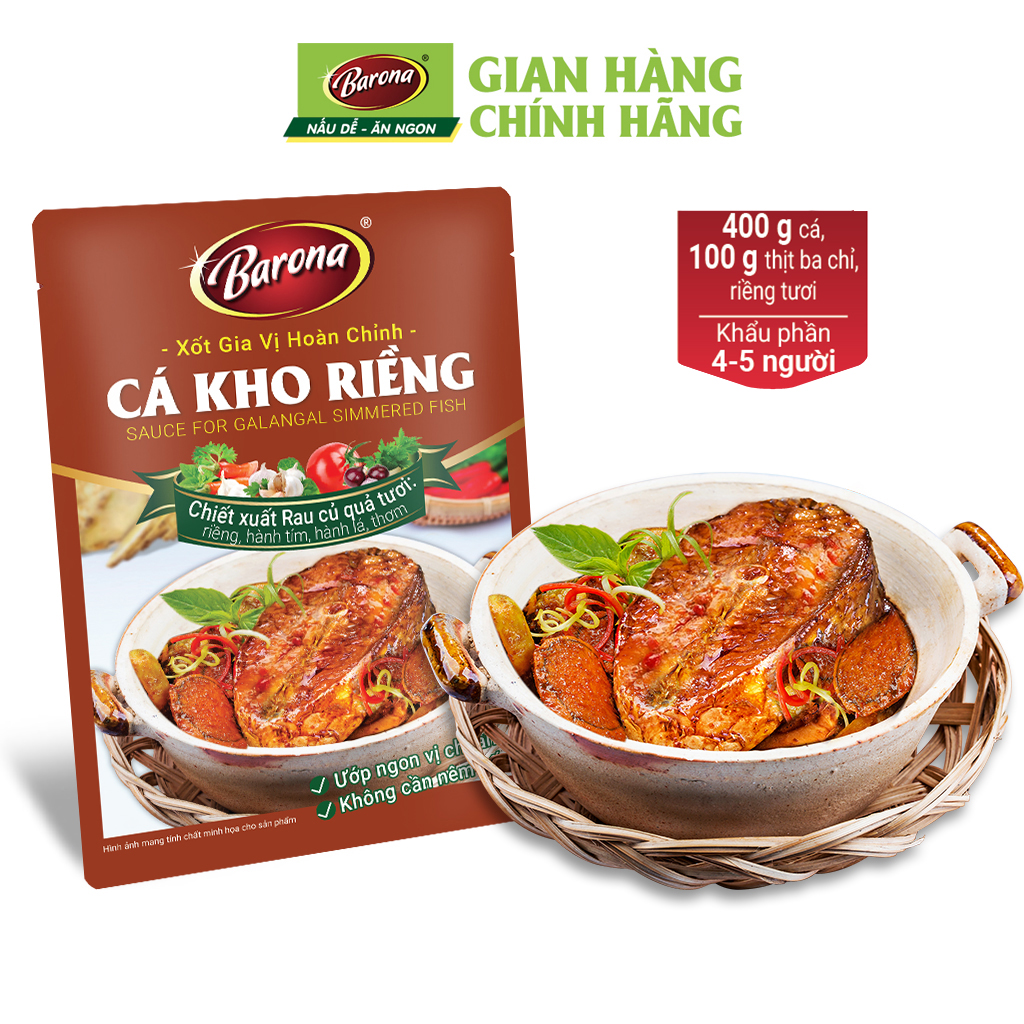 *Mẹo nhỏ: Xốt Gia Vị Hoàn Chỉnh Barona Cá Kho Riềng sẽ ngon hơn khi kho trong nồi đất (tộ) và dùng nguyên liệu cá trắm/ cá mè, có thể thêm ít nghệ tươi.