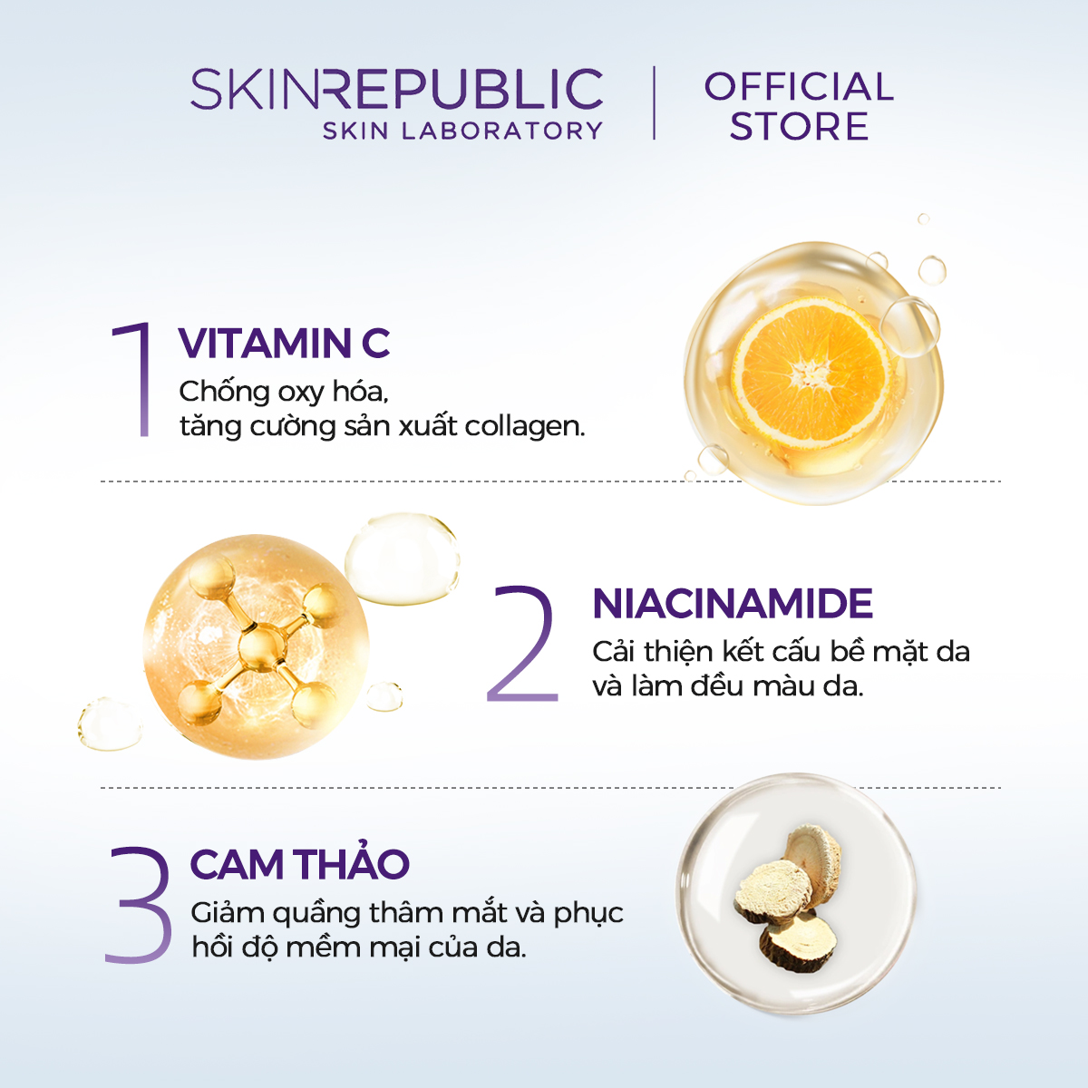 Mặt nạ mắt Skin Republic Brightening Eye Mask (3 cặp) 23ml Mặt nạ mắt được bổ sung viatmin C và niacinamide, giúp làm sáng vùng da quanh mắt, giảm sự xuất hiện của quầng thâm,
