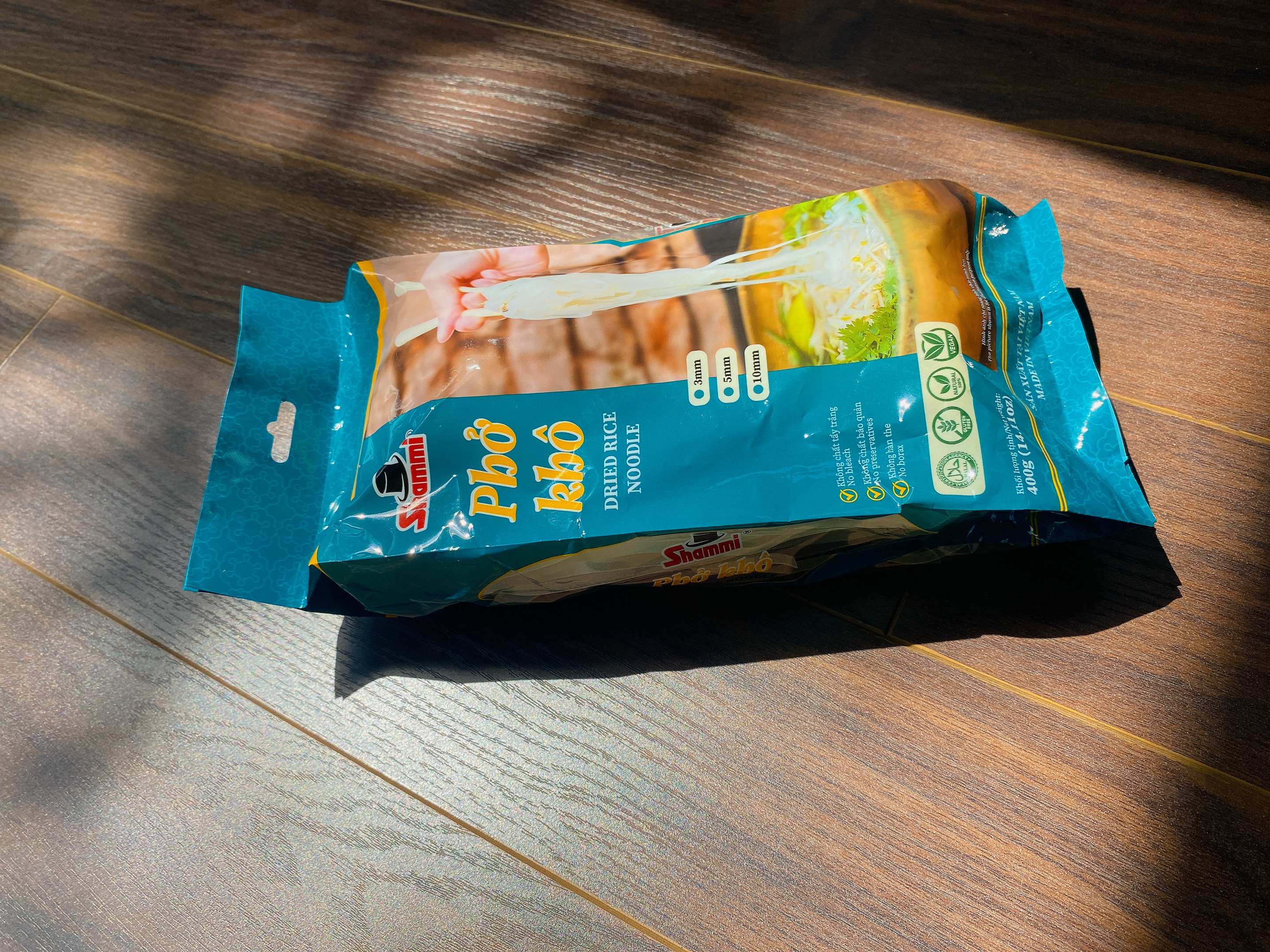 Sợi phở dai dai, bùi bùi, màu trắng chuẩn vị sợi phở Việt Nam được làm từ 100% nguyên liệu tự nhiên chất lượng, đảm bảo an toàn. Phở khô Shammi gói 400g giúp bạn