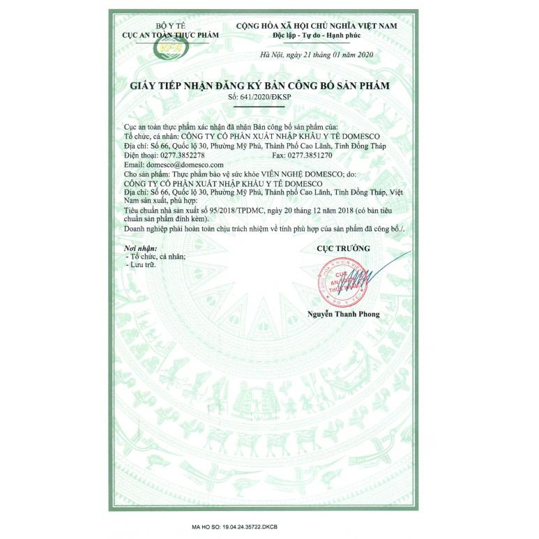 Viên nghệ vàng DOMESCO - Hộp 180 viên Thành phần Cao Nghệ vàng (tương đương 200 mg Nghệ vàng – Curcuma longa) ……. 50 mg Cao Nghệ đen (tương đương 120 mg Nghệ đen –
