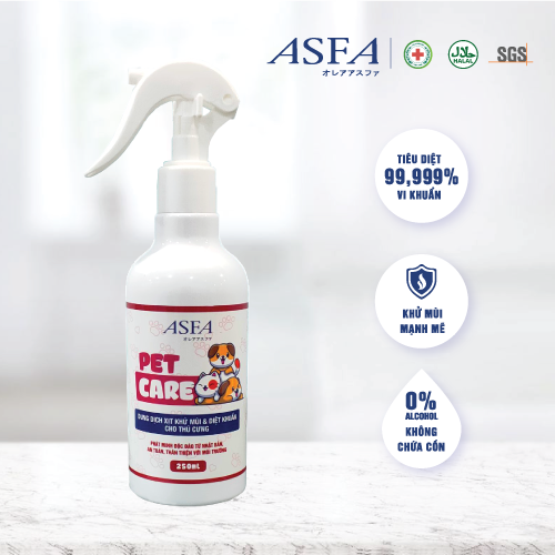 ASFA Pet Care loại bỏ các mùi hôi do lông, phân, nước tiểu của chó, mèo hoặc các loại vật nuôi khác; đánh bay mùi ẩm mốc, hôi tanh của vật dụng và chuồng trại.Đặc biệt, tiêu diệt 99,99% các loại vi...