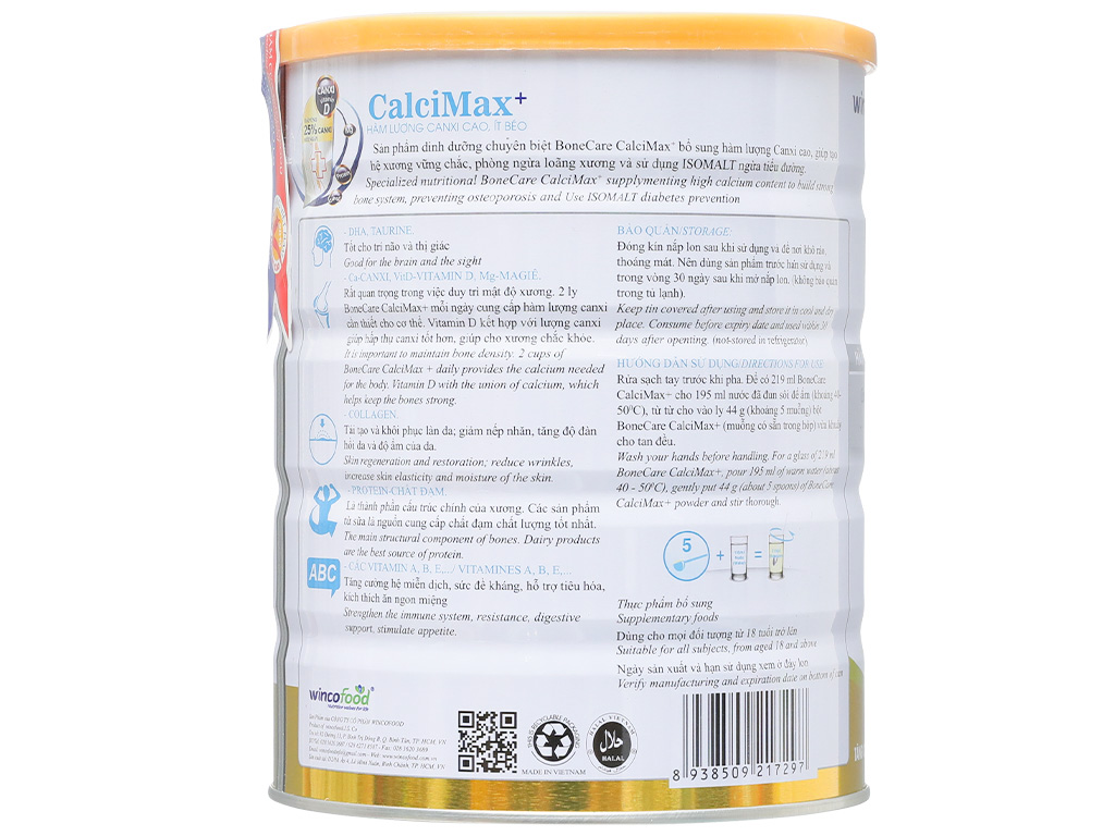 Tên sản phẩm: Thực phẩm bổ sung Sữa bột Vinamilk CanxiPro Ở người trưởng thành, Canxi chiếm 2% tổng trọng lượng cơ thể và đóng một vai trò rất quan trọng trong việc củng cố