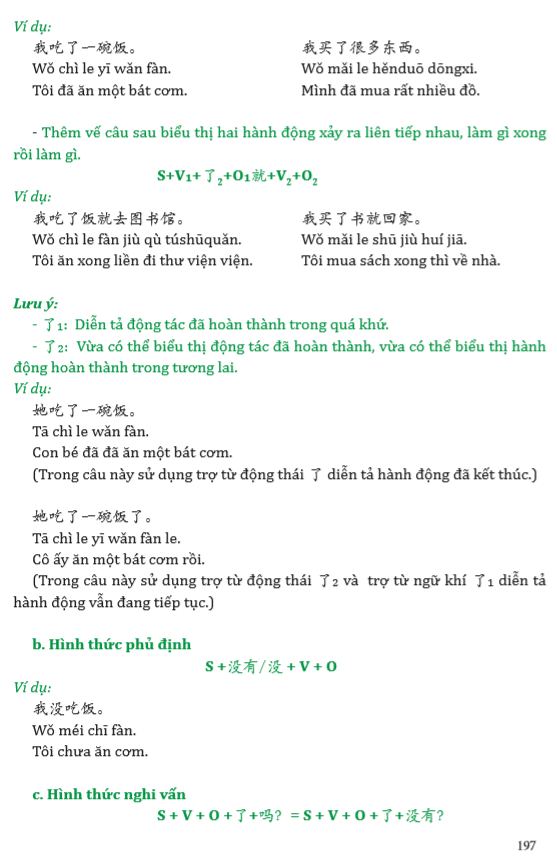 Phần 2: Ở mỗi điểm ngữ pháp, có từ 2-4 ví dụ minh họa cách sử dụng, các ví dụ được thiết kế tùy theo mục đích người học, ví dụ mang tính học thuật dành cho người học thi HSK và ví dụ giao tiếp đời sống. Ngoài ra có sự đan xen giữa hội thoại và đoạn văn giúp người học thực hành giao tiếp, thực hành luyện viết theo đoạn văn ngắn. Toàn bộ ví dụ, hội thoại và đoạn văn đều có đầy đủ phiên âm, chữ Hán, và tiếng Việt để tiện tra cứu và tự học.
