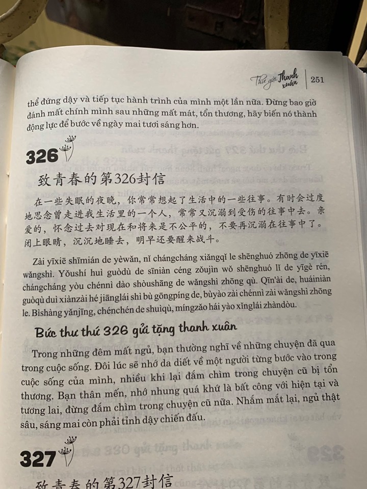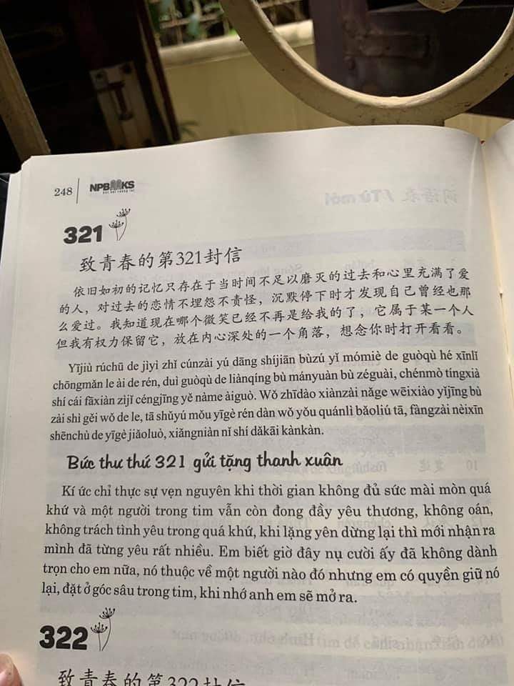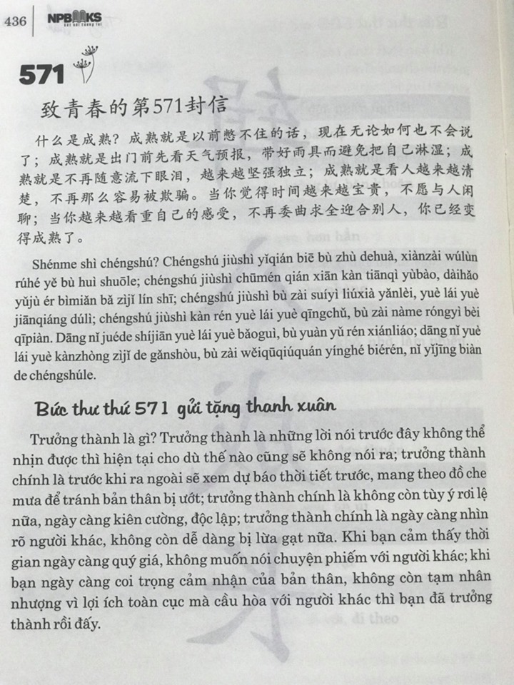 Nội dung sách:Gồm những bức thư song ngữ (Trung – Việt – Pinyin) gửi tặng thanh xuân tươi đẹp