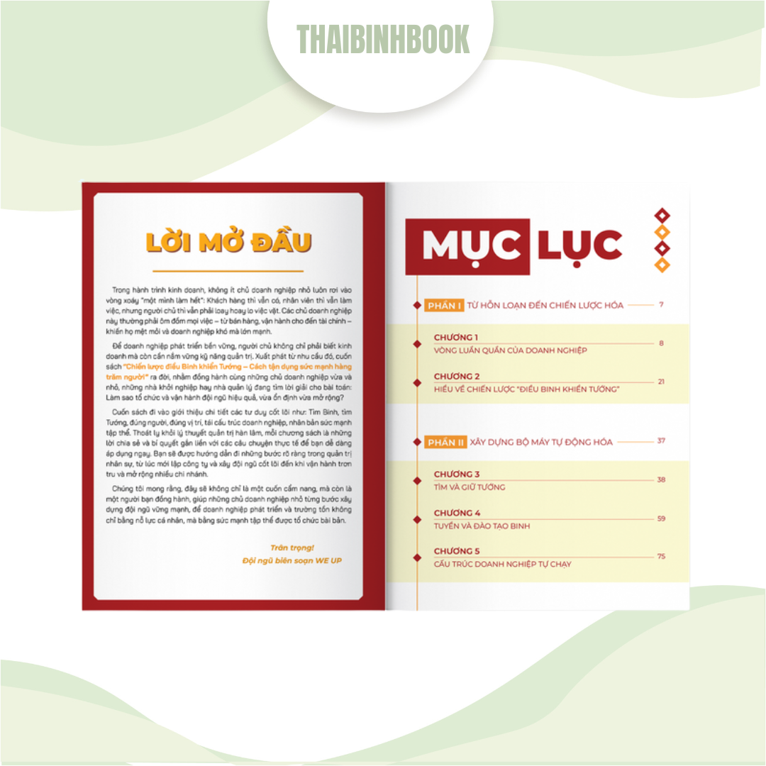 - Nội dung chính: Cuốn sách này cung cấp chiến lược và tư duy quản trị nhân sự thực tiễn, giúp bạn xây dựng một hệ thống vững mạnh để doanh nghiệp không đổ vỡ khi có sự biến động về nhân sự. Sách phân tích rõ vai trò của "Sếp - Tướng - Binh" và hướng dẫn cách xây dựng hệ thống giao việc, kiểm soát và kế thừa. Nội dung giúp bạn thoát khỏi tình trạng "sếp gánh team," không phải can thiệp vào từng công việc nhỏ, mà thay vào đó là làm chủ một bộ máy có khả năng tự vận hành trơn tru.