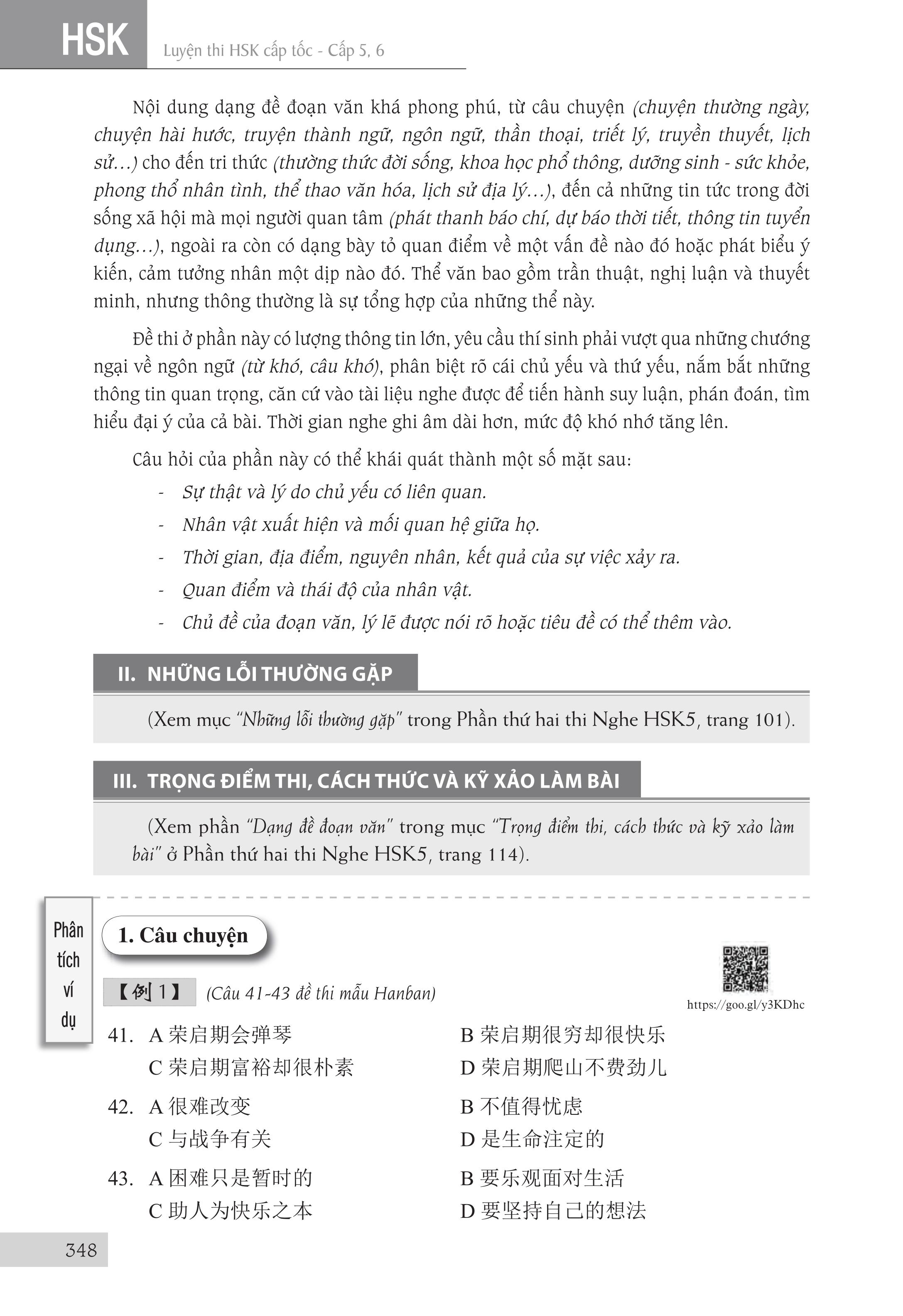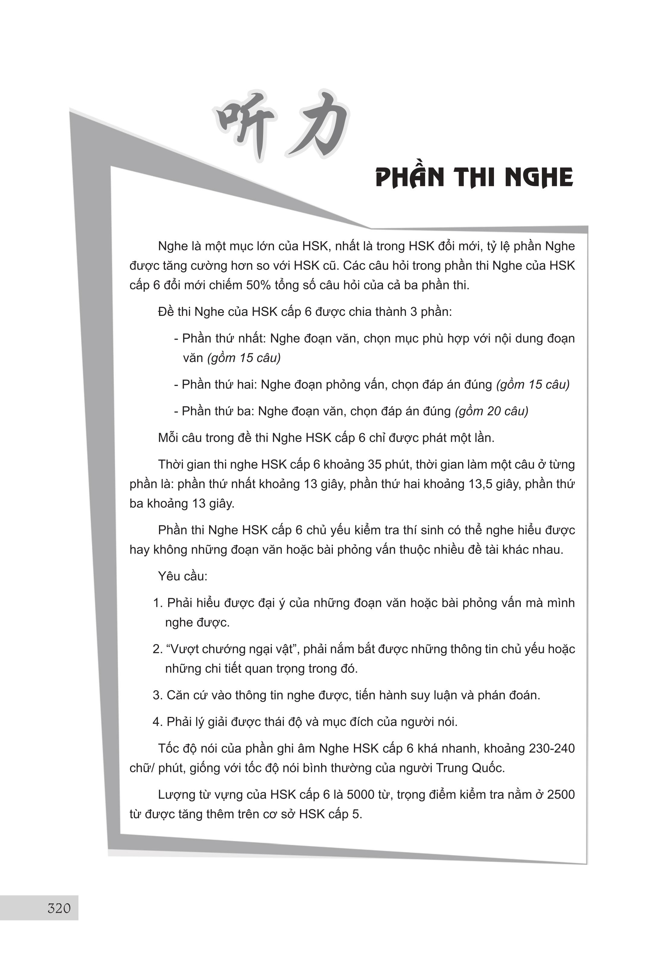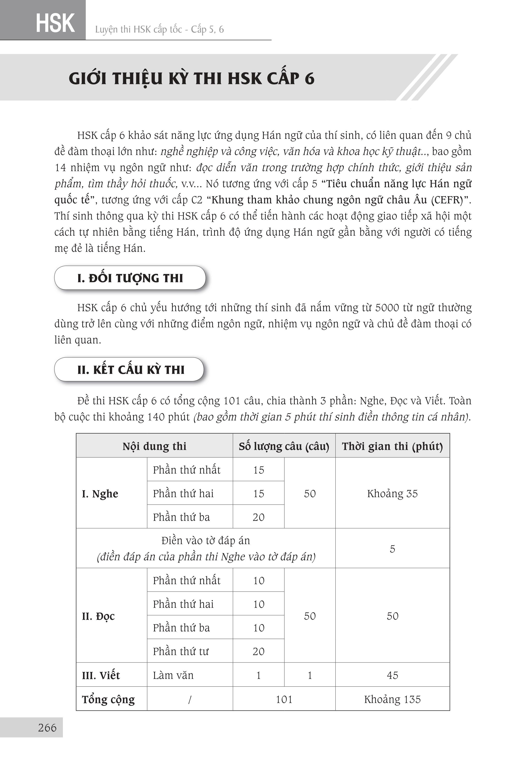 - Luyện Thi Hsk Cấp Tốc (Cấp 5-6) Tác giả: Trương Văn GIới & Lê Khắc Kiều Lục Nhà xuất bản Đại Học Quốc Gia TPHCM Số trang: 568 Kích thước: 18.5cm x 26.5cm x 2.7cm Cân nặng: 900g Năm xuất bản: 2018Đầu tiên xin được thuyết minh về chữ “cấp tốc” mà chúng tôi dùng trong tên của bộ sách. “Cấp tốc” không phải theo ý nghĩa đơn giản là nhanh và dễ dàng, không cần phải học nhiều mà cũng có thể thi đậu. Ý nghĩa của từ “Cấp tốc” mà chúng tôi hướng đến khi biên soạn bộ sách này là giúp người học nắm vững toàn bộ kiến thức của kỳ thi của một cách nhanh nhất mà vẫn bảo đảm kết quả tốt nhất. Người học vẫn phải làm việc cật lực để chuẩn bị tốt cho kỳ thi mới hy vọng có được kết quả khả quan. Kỳ thi HSK do Văn phòng Hán ngữ nhà nước Trung Quốc (gọi tắt là HANBAN) tổ chức. HANBAN đã xây dựng chuẩn kiến thức (từ vựng, điểm ngôn ngữ, chủ đề đàm thoại …) cho từng cấp độ, từ đó đưa ra đề thi mẫu tương ứng cho cấp độ thi đó. Như vậy, Đề cương và Đề thi mẫu của HANBAN chính là tài liệu chuẩn để thí sinh ôn luyện, giáo viên và các trường giảng dạy cho kỳ thi HSK. Nó cũng là đề cương để các tác giả, nhà xuất bản và các đơn vị biên soạn và xuất bản các tài liệu cho kỳ thi này. Để đạt mục tiêu “cấp tốc” đã giải thích ở trên, chúng tôi dựa vào Đề cương và Đề thi mẫu của HANBAN, cũng như những tài liệu luyện thi HSK của Trung Quốc để biên soạn bộ sách này. Từng phần của bài thi được giới thiệu qua một cấu trúc thống nhất như sau: I. Đặc điểm dạng đề: Phần này giới thiệu cấu trúc, đặc điểm và cách làm dạng bài thi này. Ở đề thi viết còn giới thiệu cách chấm điểm của dạng đề. Rõ ràng là để làm bài thi tốt, đầu tiên là phải nắm vững đề thi và biết cách làm loại đề thi đó. II. Những lỗi thường gặp: Chúng tôi tổng hợp những lỗi thường gặp của thí sinh khi làm dạng đề thi này. Học tập từ sai lầm là cách cực kỳ hiệu quả để tránh lặp lại những sai lầm của những người đi trước đã gặp phải khi làm bài. III. Trọng điểm thi, cách thức và kỹ xảo làm bài: Đây là phần quan trọng nhất của tài liệu Phần trọng điểm thi giới thiệu những trọng tâm mà dạng đề thi tập trung vào. Liên quan đến trọng điểm thi này, chúng tôi đã hệ thống hóa các điểm ngôn ngữ, công thức hóa các cấu trúc ngữ pháp cũng như tập hợp các từ ngữ có liên quan. Tiếp theo, người học sẽ được giới thiệu về cách thức, kỹ xảo làm bài. Cuối cùng là Mục phân tích ví dụ, Phần này được chúng tôi biên soạn hết sức công phu vì biết rằng những lý thuyết, những phân tích ở phần trọng điểm thi, cách thức kỹ xảo làm bài sẽ rất khó được nắm bắt nếu không có những ví dụ cụ thể. Những ví dụ được sử dụng được lấy từ các đề thi, ưu tiên lấy từ đề thi mẫu của HANBAN, để minh họa cho những vấn đề đã được giới thiệu ở phần trọng điểm thi và cách thức kỹ xảo làm bài. DVD đi kèm và link Online backup chứa 30Gb dữ liệu quà tặng, Chi tiết: 200 bộ đề thi HSK tuyển chọn có audio nghe và đáp án từ HSK 1 – HSK 6 Tài liệu dành cho người mới bắt đầu học tiếng Trung 5099 Từ vựng HSK 1-6 Anh – Trung – Việt, có Audio nghe 10,000 ví dụ minh hoạ từ vựng HSK1 – HSK6 Anh Trung Việt có audio nghe, tiếng Trung bồi, pinyin, Trung giản thể và phồn thể Hệ thống từ điển thành ngữ tiếng Trung Hệ thống hàng ngàn bài từ vựng tiếng Trung theo chủ đề Giáo trình luyện thi HSK từ sơ cấp đến cao cấp Giáo trình ngữ pháp tiếng Trung Bộ giáo trình Hán ngữ thông dụng nhất (kèm file nghe) Tài liệu học giao tiếp tiếng Trung theo tình huống 3000 câu giao tiếp thông dụng trong tiếng Trung 1000 câu giao tiếp cơ bản trong tiếng Trung Giáo trình dạy tiếng Việt cho người Trung Quốc Kho sách về du lịch Trung Quốc Ví dụ minh hoạ 900 câu đàm thoại tiếng Trung du lịch Ví dụ minh hoạ 1099 từ ghép tiếng Trung thông dụng Tam ngữ Anh Trung Việt Từ Lóng Tiếng Trung hiện đại Minh hoạ 2102 từ vựng hack não chiết tự siêu dễ nhớ! Audio nghe 5099 từ vựng HSK 1 – HSK 6 cùng Ví dụ Anh Trung Việt + Audio nghe 10,000 ví dụ Audio nghe 1099 từ ghép tiếng Trung thông dụng kèm 1099 ví dụ Anh – Trung – Việt & audio nghe Audio Nghe 1001 Bức Thư Viết Cho Tương Lai Audio Nghe 999 Bức Thư Viết Cho Bản Thân (2018) Audio Nghe sách bá đạo TỪ LÓNG tiếng Trung Audio nghe sách Tam ngữ Hack Não Siêu Dễ Nhớ Chiết Tự 2102 từ tiếng Trung thông dụng Audio Nghe Phát triển từ vựng tiếng Trung Ứng dụng Audio Nghe Sách Du Lịch Việt Nam – Ẩm Thực và Cảnh Điểm Audio Nghe sách Trung Quốc 247: Góc nhìn bỡ ngỡ Audio Nghe sách Trung Quốc 247: Mái nhà thân thuộc Audio nghe sách Cuộc đời phụ nữ: Muôn vàn lý do hạnh phúc Audio nghe sách 123 Thông điệp thay đổi tuổi trẻ Audio Nghe sách 101 Thông điệp thay đổi cuộc đời phụ nữ Audio sách Luyện dịch