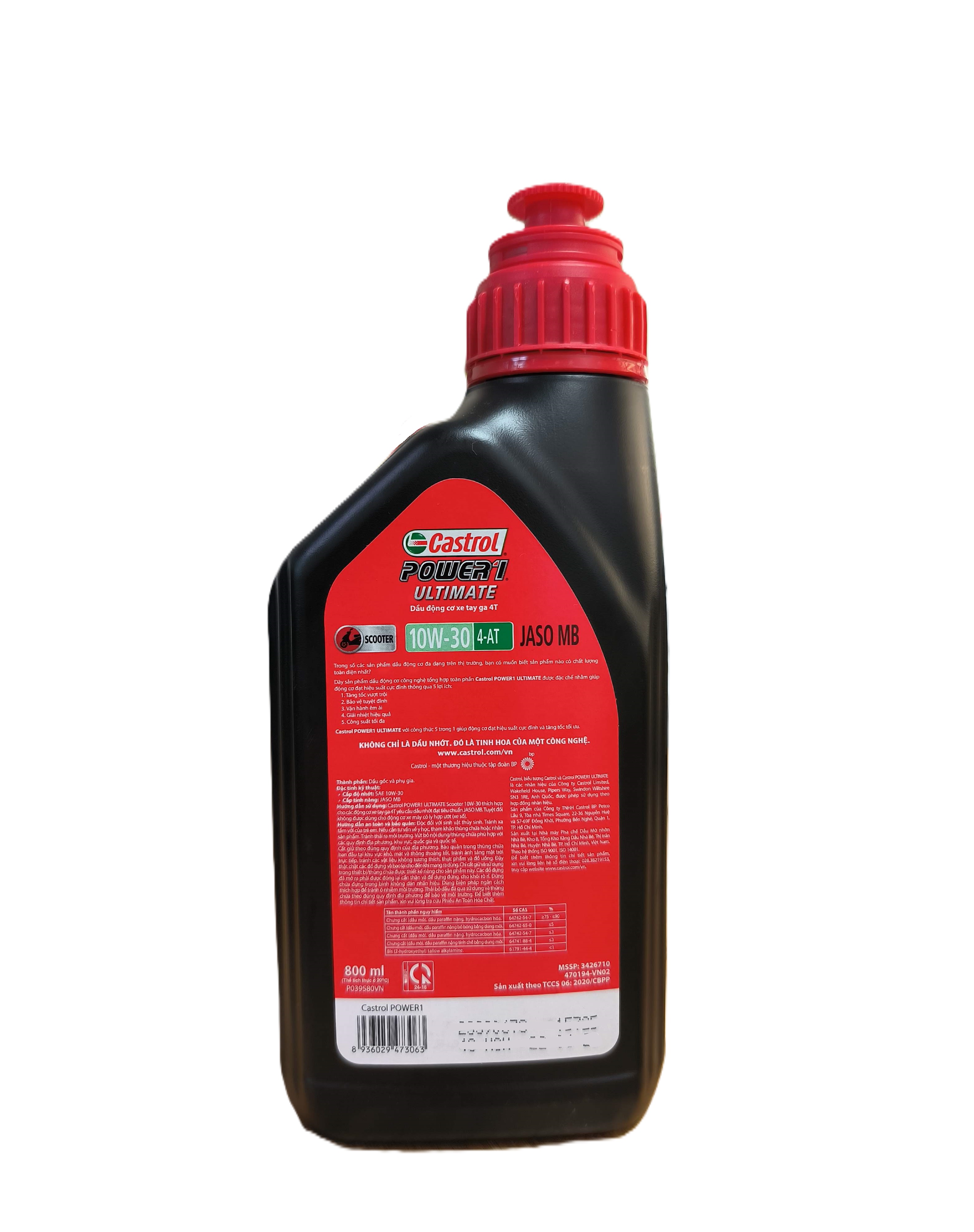 Mua tại TiktokCastrol Power 1 Ultimate Scooter 10W-30 là sản phẩm dầu nhớt cao cấp của Castrol dành cho xe tay ga Castrol POWER1 ULTIMATE SCOOTER 5W-30 4T thích hợp sử dụng cho mọi động cơ xe tay ga (không sử dụng cho xe số), bao gồm các loại xe sử dụng chế hòa khí hoặc phun xăng điện tử khuyến nghị dầu nhớt đạt tiêu chuẩn JASO MB. TIÊU CHUẨN KỸ THUẬT SAE 5W-30 JASO MB DẦU GỐC Dầu công nghệ tổng hợp toàn phần LỢI ÍCH Dầu động cơ công nghệ tổng hợp toàn phần Castrol POWER1 ULTIMATE với công thức 5 trong 1 giúp: