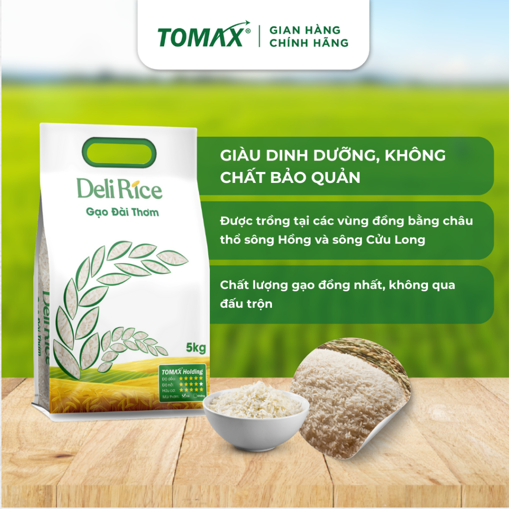 COMBO 2 TÚI 5KG GẠO ĐÀI THƠM DELI RICE - TƠI XỐP, DẺO THƠM, THƠM DỊU - TOMAX Gạo hữu cơ Đài Thơm Deli Rice 100% không có chất bảo quản, không có chất chống mọt, chống nấm, chất tẩy trắng an toàn tuyệt đối cho người sử dụng. Giá trị dinh dưỡng trong mỗi hạt gạo cao vì được phát triển tự nhiên như vitamin B1, B3, B6, sắt, kẽm, Omega 3… tăng cường sức khỏe cho cả gia đình mỗi ngày. Gửi gắm trong những sản phẩm tinh khiết và chất lượng, TOMAX Holding ước mong, mỗi bữa cơm sẽ là nơi gia đình gắn kết thân tình thêm bền chặt và những phút sum vầy luôn trọn vị yêu thương. 05 Lý Do Nên Chọn Gạo Sạch Hữu Cơ Đài Thơm Deli Rice: Cung cấp nguồn dinh dưỡng dồi dào cho cơ thể để duy trì sức khỏe tốt nhất. Tăng cường sức đề kháng, cải thiện hệ miễn dịch và phòng ngừa nhiều loại bệnh như tim mạch, huyết áp, đột quỵ,... Gạo được trồng theo phương pháp 100% hữu cơ nên an toàn cho mọi đối tượng, đặc biệt tốt cho người già, người sức khỏe kém, trẻ nhỏ,.. Gạo hữu cơ có chỉ số đường huyết thấp, giàu chất xơ hỗ trợ giảm cân, chống oxy hóa, bảo vệ sức khỏe toàn diện. Chất lượng sản phẩm được kiểm định kỹ lưỡng, date xa, giá tốt, giao hàng nhanh. THÔNG TIN SẢN PHẨM Thành phần: 100% Gạo trắng Đài thơm chất lượng cao, đóng gói theo tiêu chuẩn Châu u (HACCP) Thông tin dinh dưỡng (trong 100g gạo):